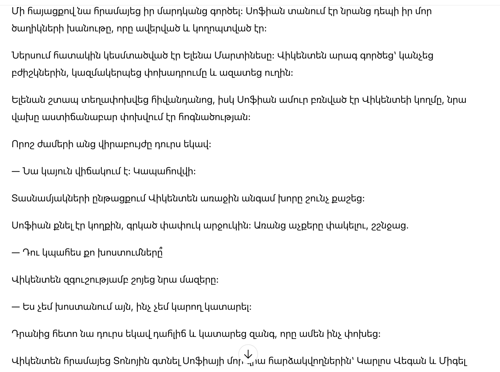 Она не потерялась; бежала от чего-то. Игнорируя персонал, она побежала к Викенте и схватила его за рукав.