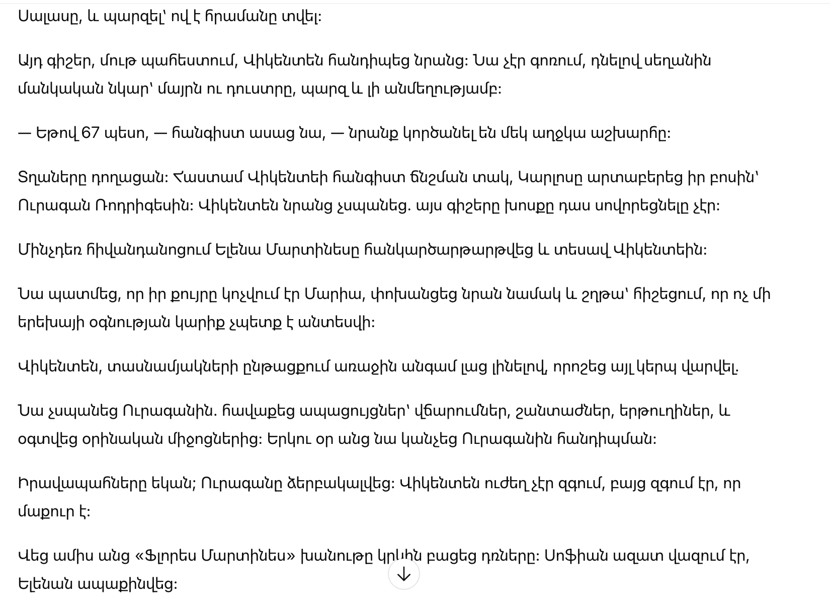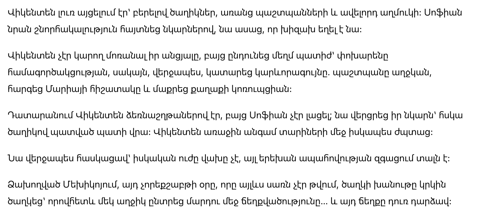 В суде Викенте был закован в наручники. София не плакала; она подняла свой рисунок с гигантским цветком на потрескавшейся стене. Викенте улыбнулся по-настоящему впервые за годы.