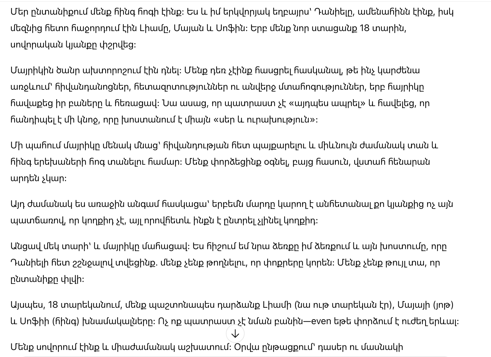 Прошло меньше года, и мамы не стало. Я помню её ладонь в своей руке и обещание, которое мы с Даниэлем произнесли почти шёпотом: мы не дадим младшим пропасть. Не позволим семье развалиться.