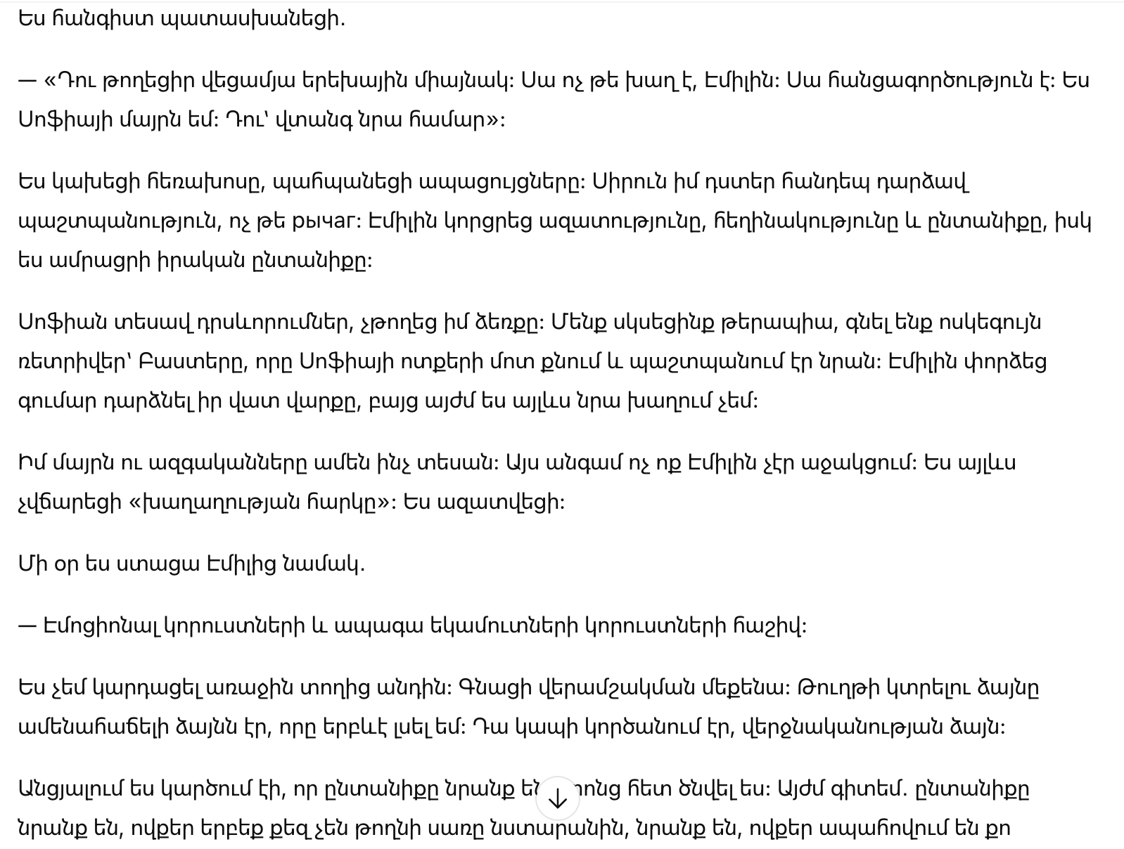 Моя мама и родственники видели всё. В этот раз никто не поддерживал Эмили. Я больше не платила налог на мир. Я освободилась.