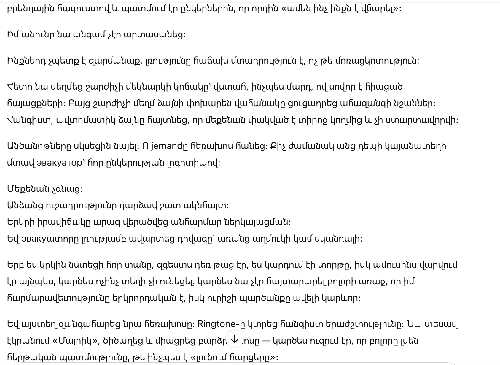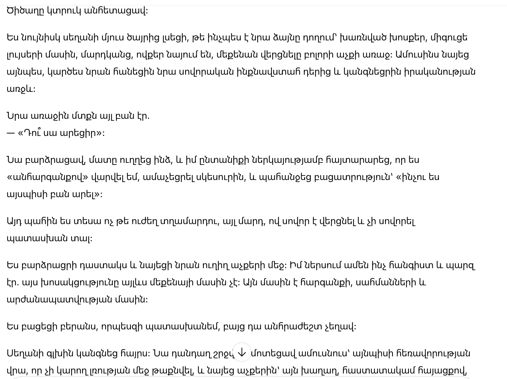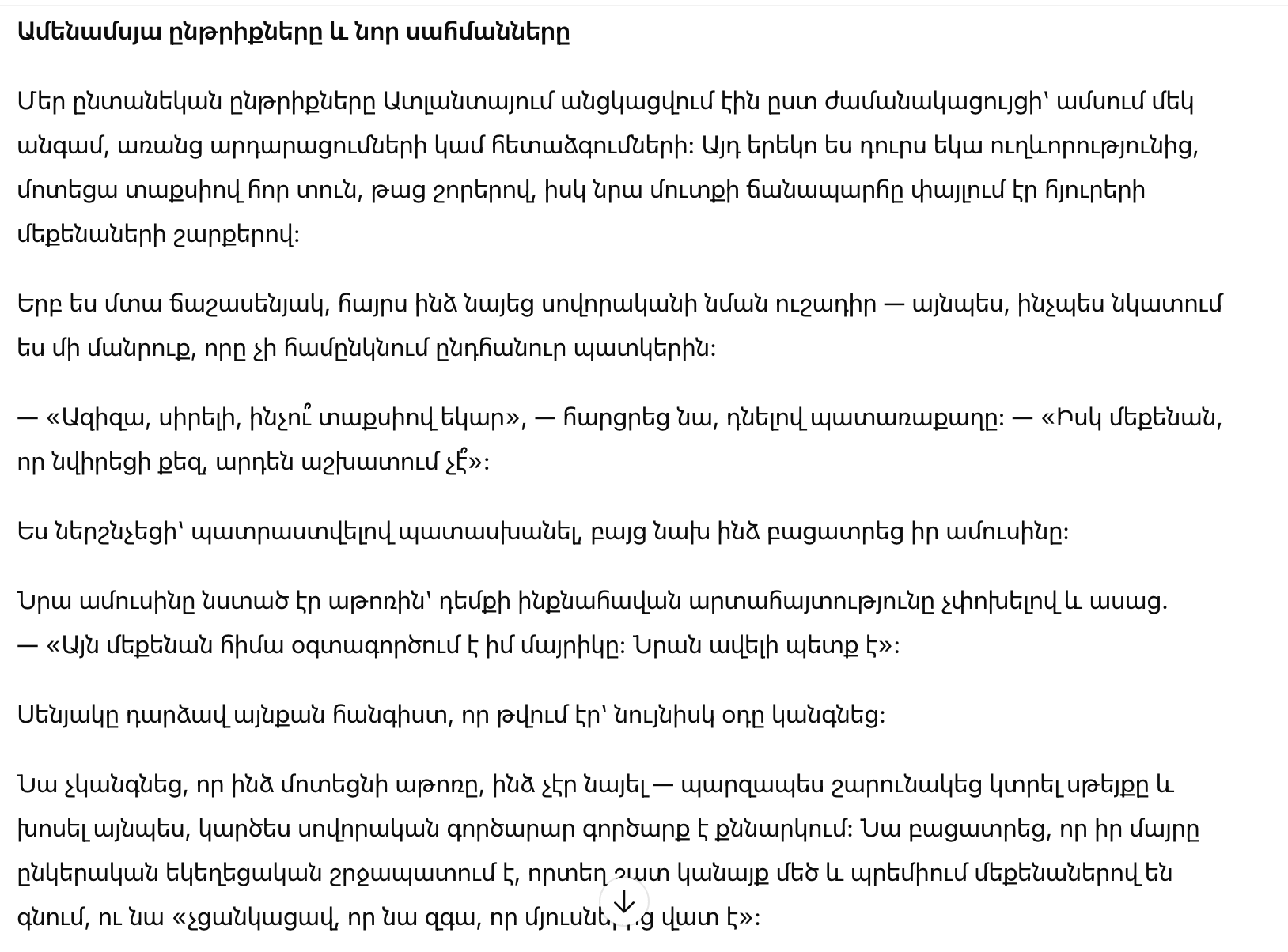 «Азиза, милая, почему ты приехала на такси?» — спросил он, отложив вилку. — «Машина, которую я тебе подарил, уже подвела?»