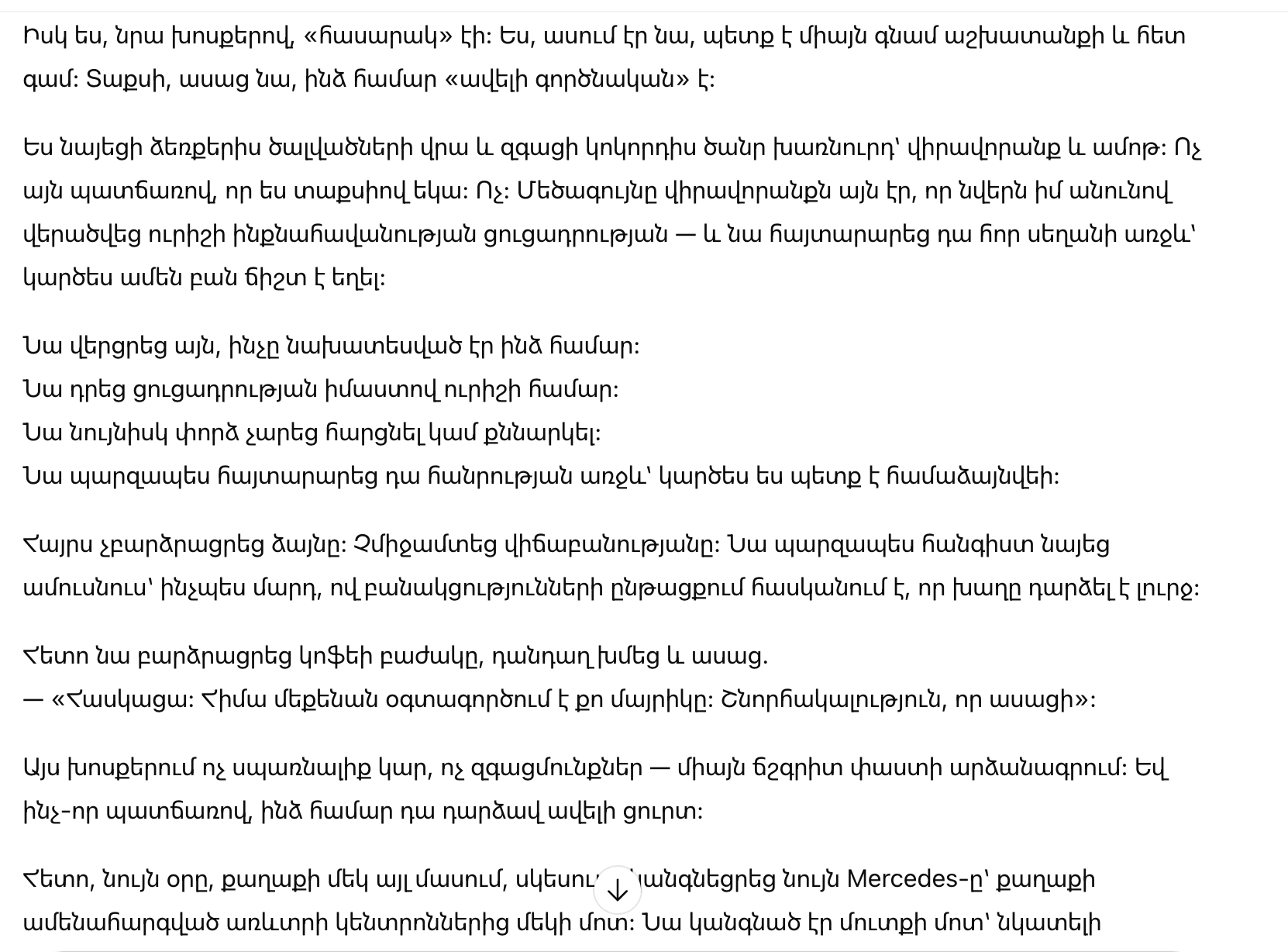 Он не встал, чтобы подвинуть мне стул, не взглянул на меня — просто продолжил резать стейк и говорить так, будто обсуждает обычную деловую сделку. Он объяснил, что свекровь общается в церковном кругу, где многие женщины ездят на больших премиальных авто. И он «не хотел, чтобы она чувствовала себя хуже других».