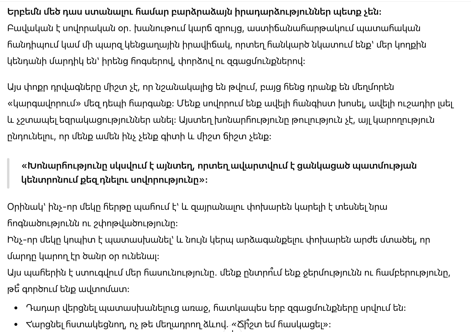 Эти маленькие эпизоды не всегда выглядят значимыми, но именно они мягко «настраивают» нас на уважение. Мы учимся говорить спокойнее, слушать внимательнее и не делать поспешных выводов. Смирение здесь — не про слабость, а про умение признать: мы не знаем всего и не всегда правы.