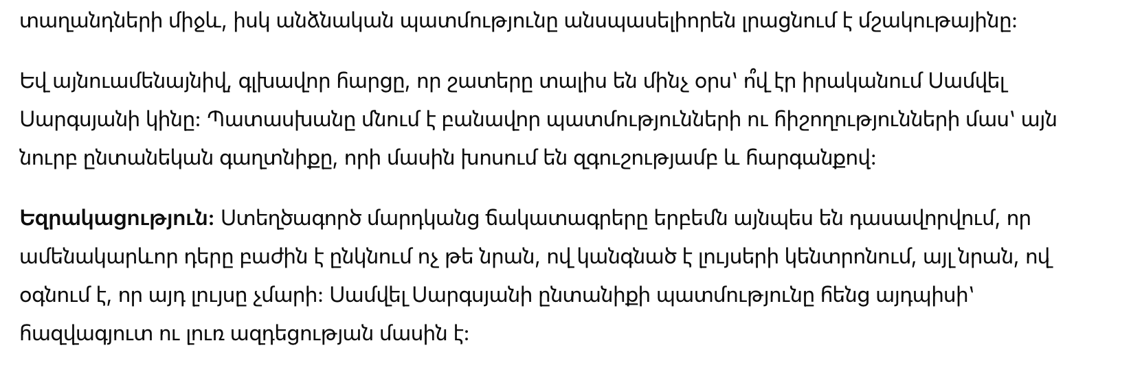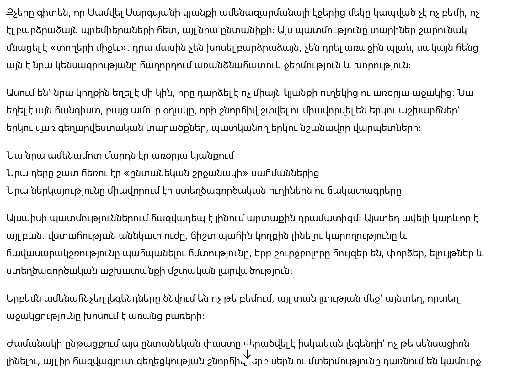 Вывод: судьбы творческих людей порой складываются так, что самая важная роль достаётся не тому, кто стоит в свете софитов, а тому, кто помогает этому свету не погаснуть. История семьи Самвела Саргсяна — именно о таком редком, тихом влиянии.