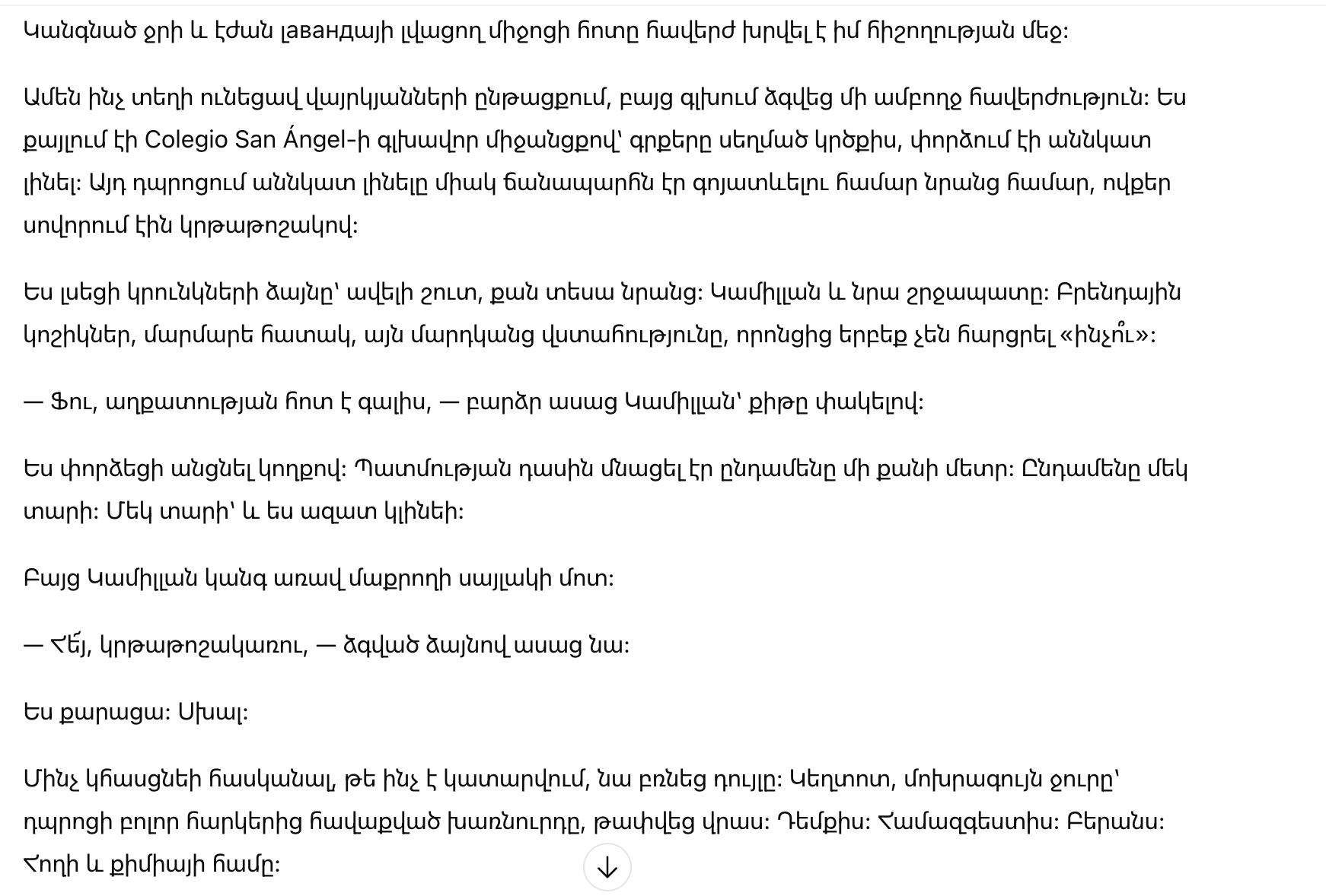 Карлос поднял руку, возможно, чтобы ударить меня, возможно, просто от чистого рефлекса. Но он остановился. Он, оглядываясь, заметил камеры телефонов тех же ребят, которые до сих пор смеялись над его жестокими шутками. Он увидел, что он больше не король этой земли. Он стал жалким зрелищем.
