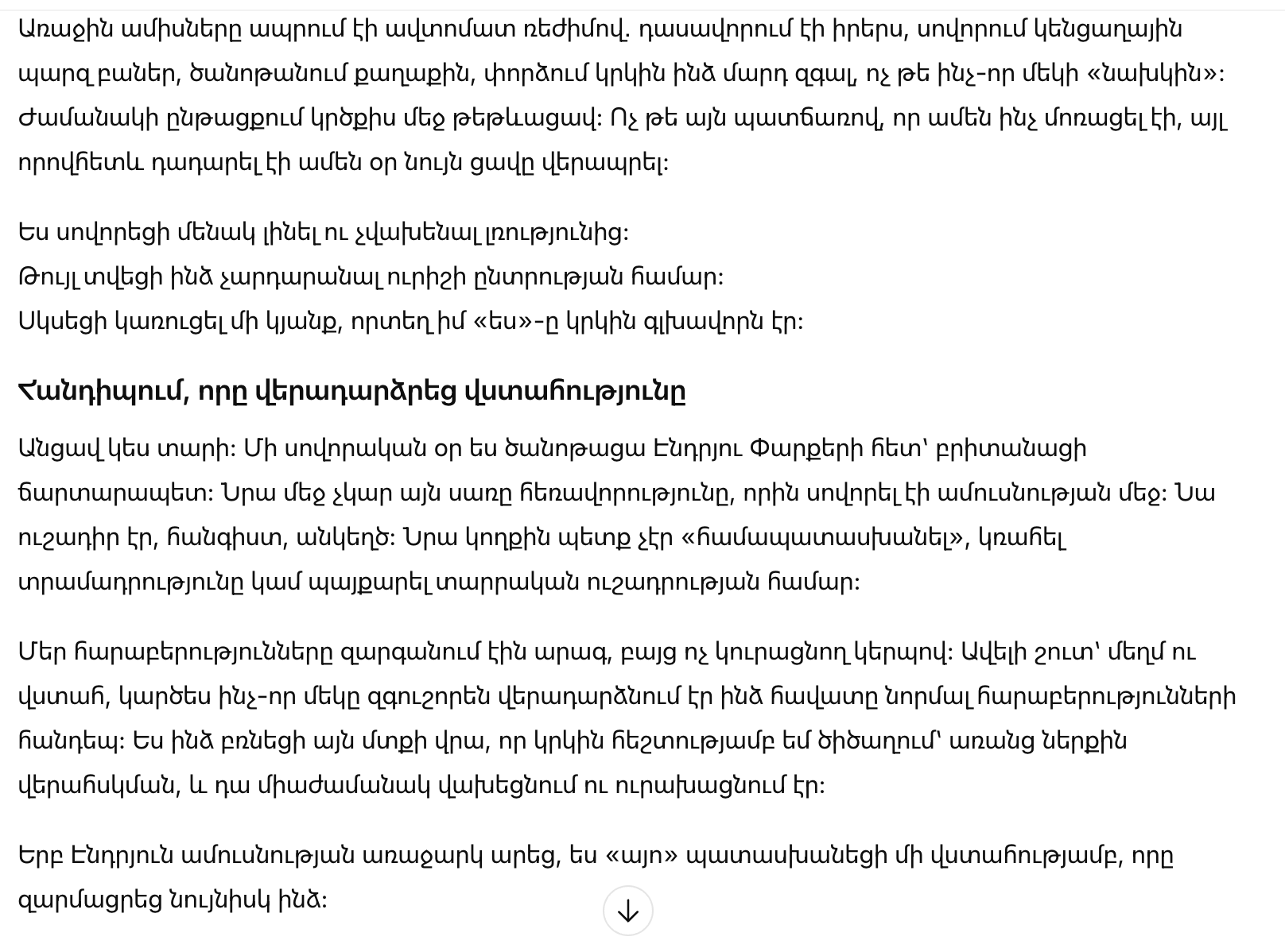 Прошло полгода. В один из обычных дней я познакомилась с Эндрю Паркером — британским архитектором. В нём не было той холодной отстранённости, к которой я привыкла в браке. Он был внимательным, спокойным, искренним. Рядом с ним не нужно было «соответствовать», угадывать настроение или бороться за элементарное участие.