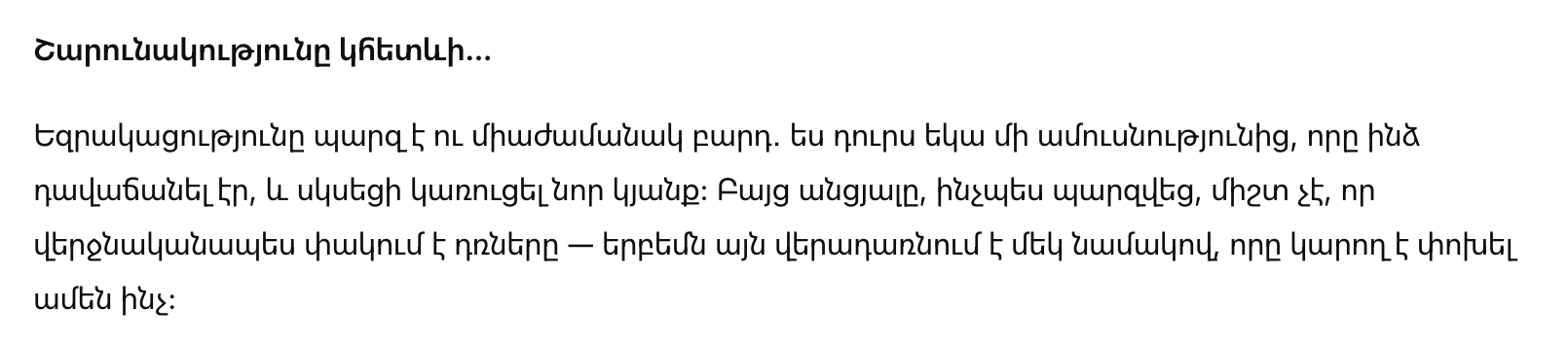 Первые месяцы я жила на автомате: разбирала вещи, училась простым бытовым мелочам, знакомилась с городом, пыталась снова почувствовать себя человеком, а не чьей-то «бывшей». Постепенно в груди стало легче. Не потому, что я всё забыла — потому, что я перестала каждый день проживать это заново.