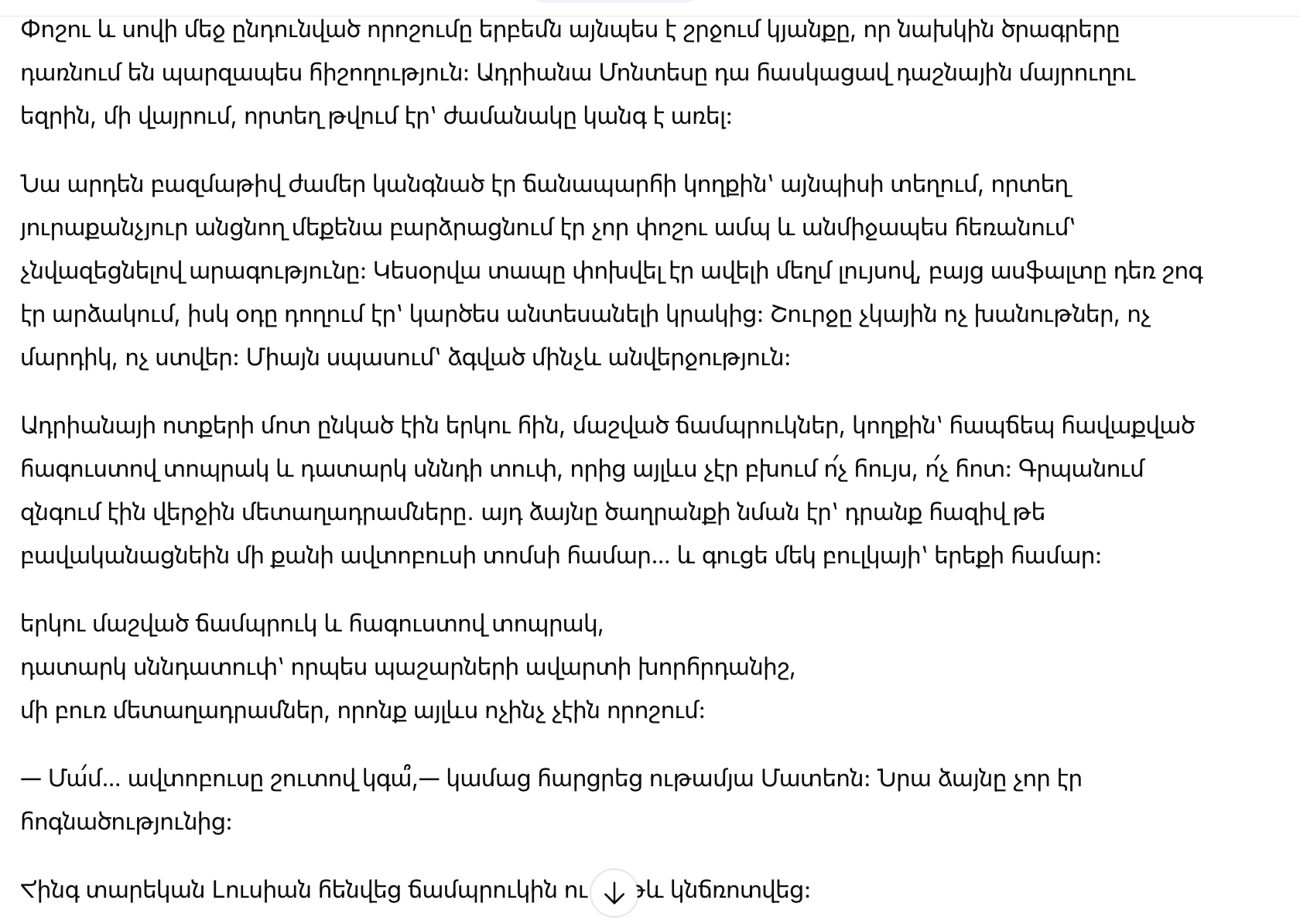 У ног Адрианы лежали две старые потрёпанные сумки, рядом — пакет с кое-как сложенной одеждой и пустая коробка для еды, от которой больше не исходило ни надежды, ни запаха. В кармане звякали последние монеты — звук казался насмешкой: их едва хватило бы на пару автобусных билетов… и, возможно, на одну булочку на троих.