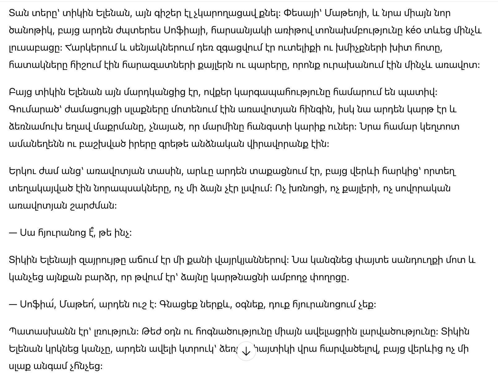 Однако донья Елена была из тех, кто считает порядок делом чести. Едва стрелки часов приблизились к пяти утра, она уже поднялась и взялась за уборку, хотя тело просило отдыха. Для неё грязная посуда и разбросанные вещи были почти личным оскорблением.