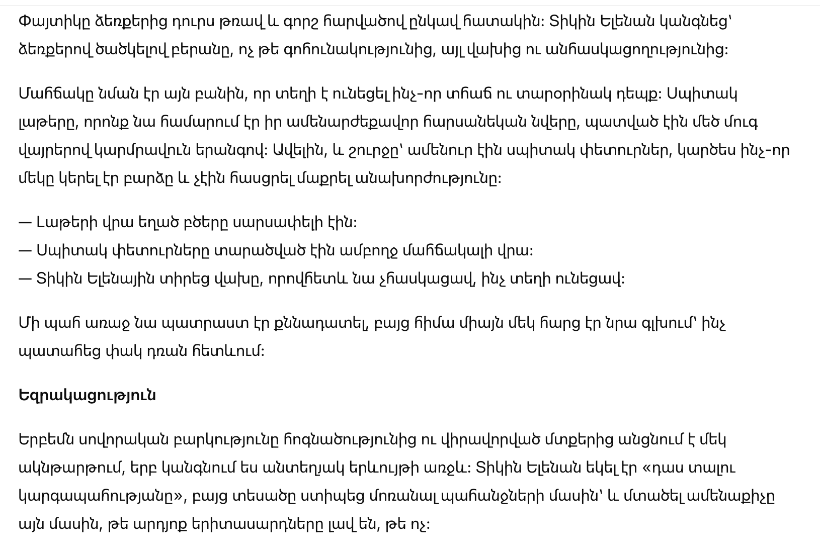 Постель выглядела так, будто в ней произошёл какой-то неприятный и странный инцидент. На белых простынях, которые она считала своим самым ценным свадебным подарком, расплылись большие тёмные пятна с красноватым оттенком. А поверх них и вокруг — повсюду — лежали белые перья, словно кто-то разорвал подушку и не успел убрать беспорядок.