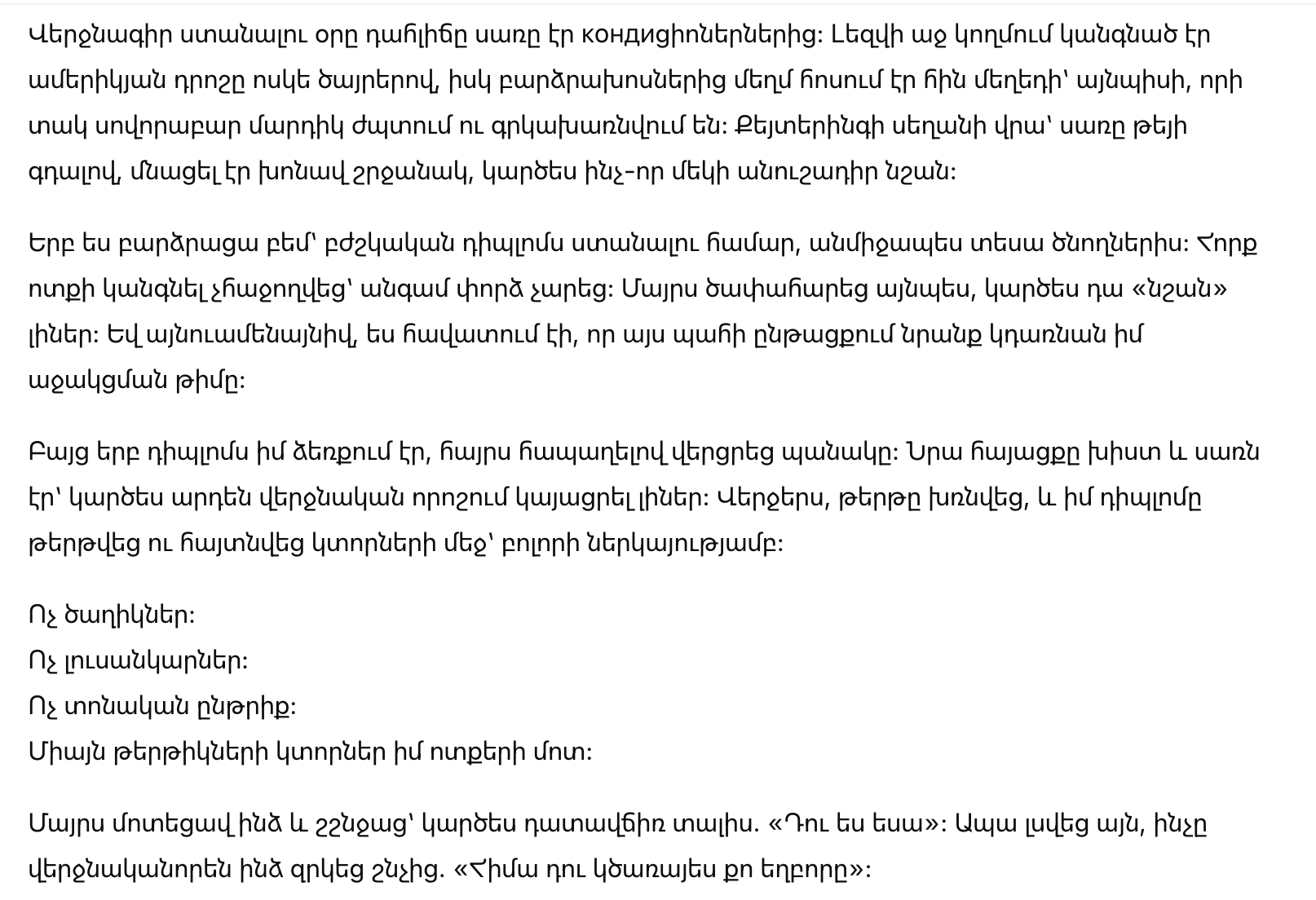 В день вручения дипломов в зале было холодно от кондиционеров. Справа от трибуны стоял американский флаг с золотистой бахромой, а из колонок тихо лилась старая мелодия — такая, под которую обычно улыбаются и обнимаются. На столе кейтеринга кувшин с холодным чаем оставил мокрый круг, будто чья‑то небрежно поставленная точка.