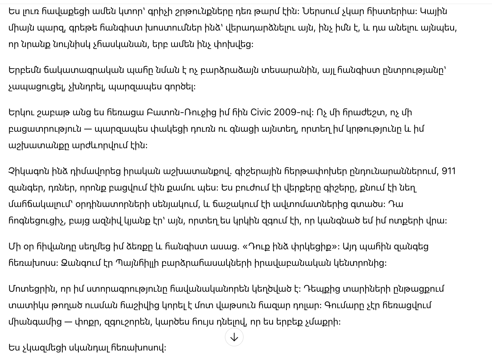 Через две недели я уехала из Батон-Руж на своей старенькой Civic 2009 года. Я не устраивала прощаний и не объяснялась — просто закрыла дверь и поехала туда, где моё образование и мой труд имели значение.