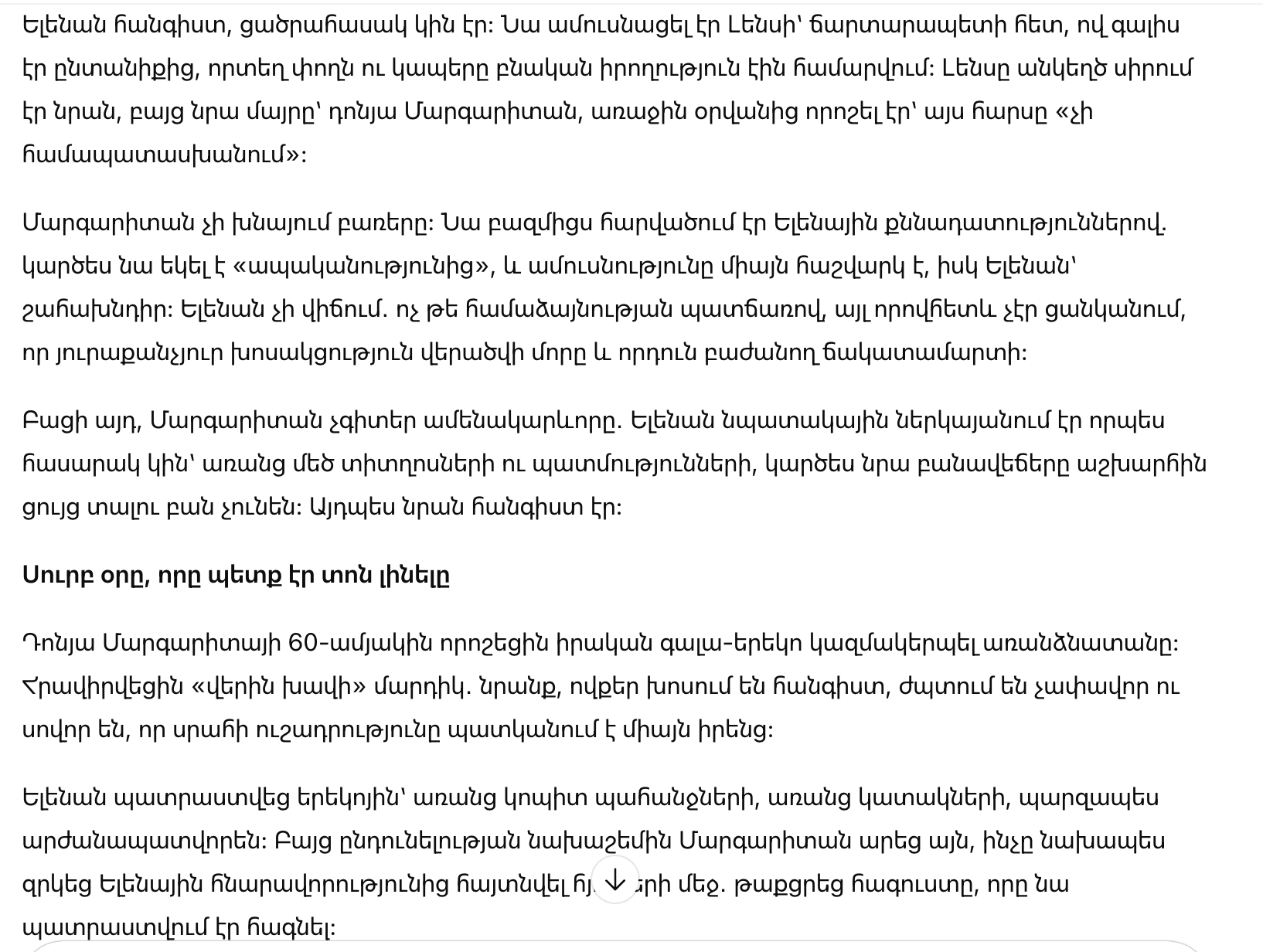 К тому же Маргарита не знала главного: Елена намеренно представлялась в их окружении обычной женщиной без громких титулов и историй — как будто ей нечего предъявлять миру. Так ей было спокойнее.