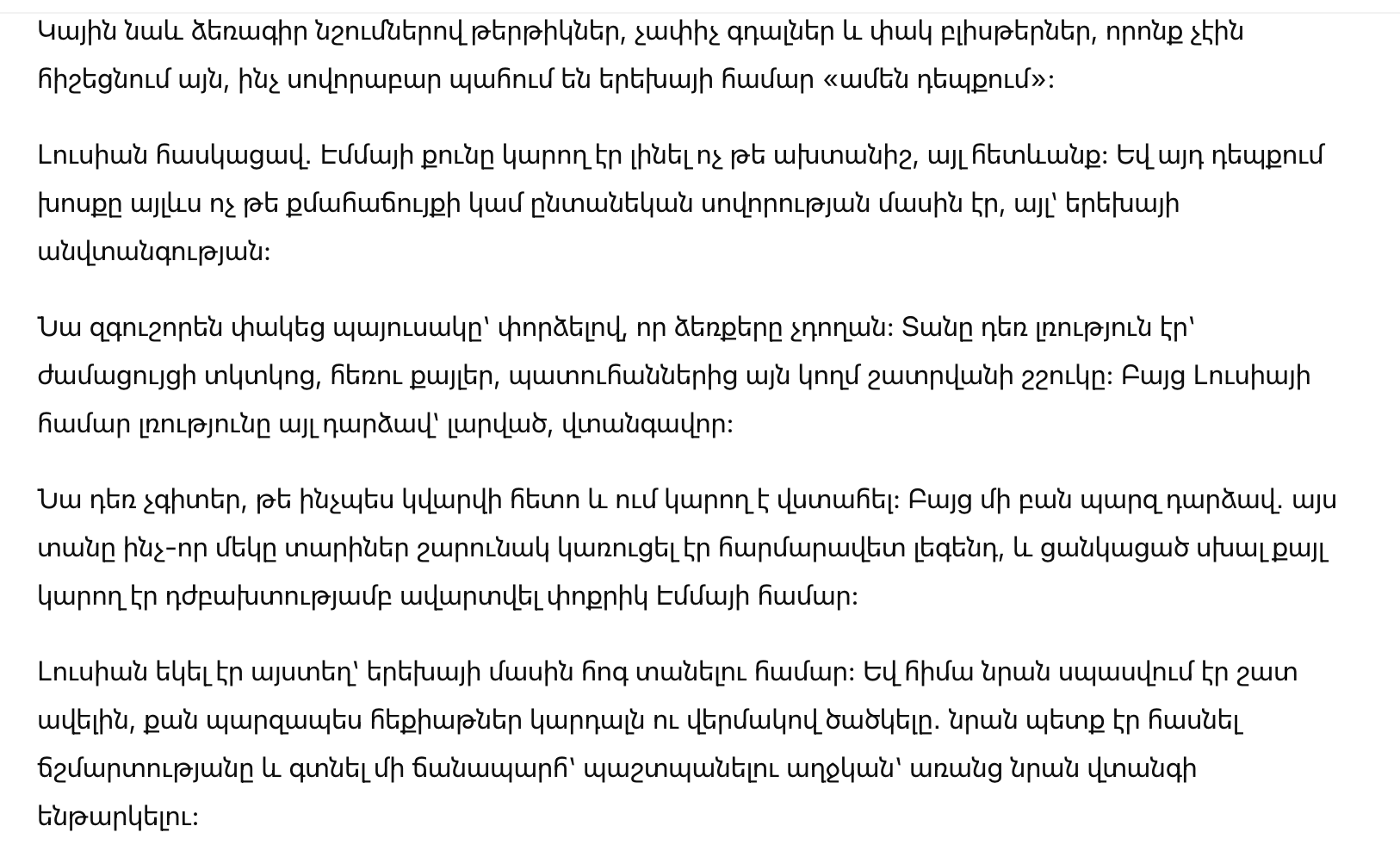 Веки Эммы будто постоянно тянуло вниз. На руках она казалась необычно вялой, словно сил у неё не оставалось даже на обычную детскую возню. Еда почти всегда оставалась нетронутой. И всякий раз, когда девочка начинала шевелиться или пыталась проснуться, Елена появлялась слишком быстро — как человек, который ждал именно этого момента.
