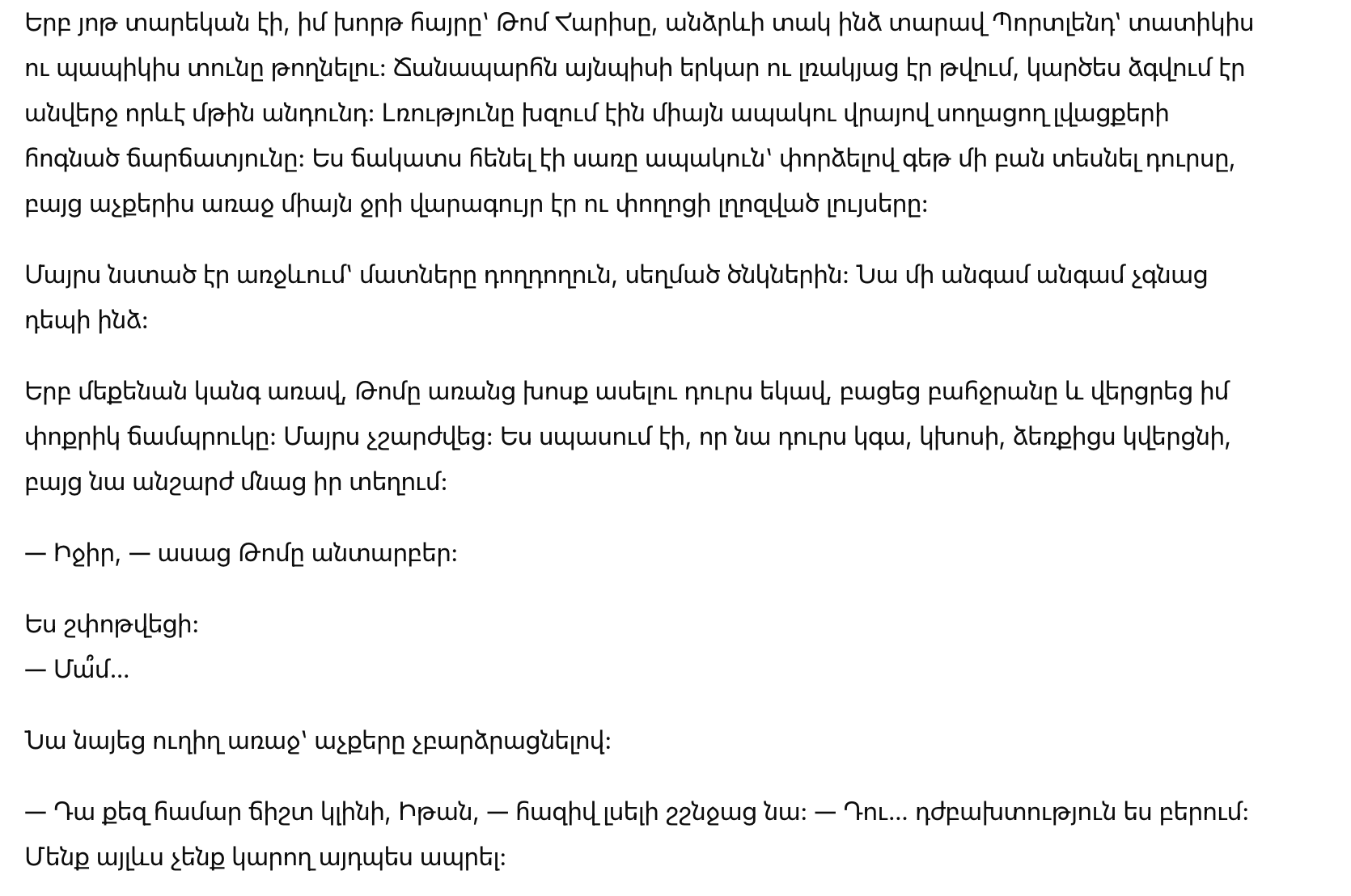 Когда автомобиль наконец замедлился, Том вышел, не произнеся ни слова, и вытащил из багажника мою маленькую чемоданчик. Моя мама осталась в машине. Я ждал, что она выйдет, объяснит мне ситуацию, возьмет за руку. Но она так и не сдвинулась с места.