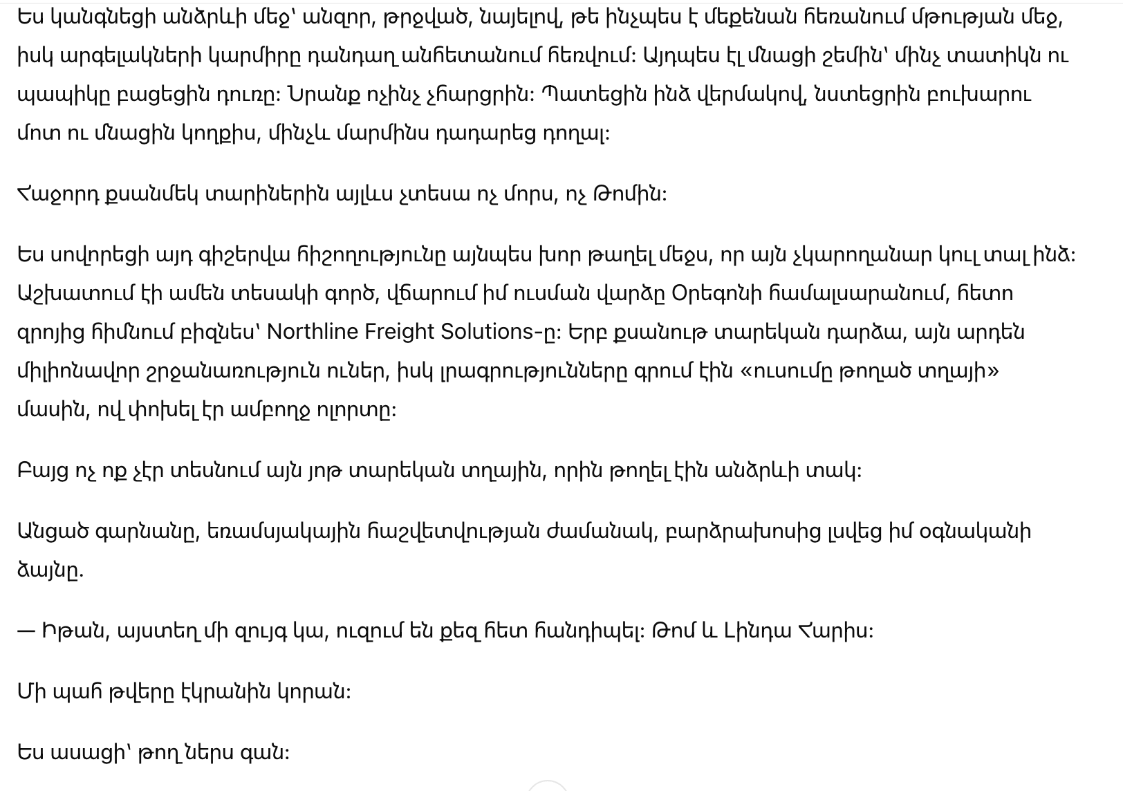 Я научился зарывать воспоминания о той ночи так глубоко, чтобы они не поглотили меня. Я брался за любую работу, оплачивая учебу в Университете Орегона и строя бизнес с нуля — Northline Freight Solutions. В двадцать восемь лет это была уже компания с тридцатимиллионным оборотом, меня называли «бросившим учебу, который изменил индустрию». Люди видели успех, заголовки в газетах, интервью.
