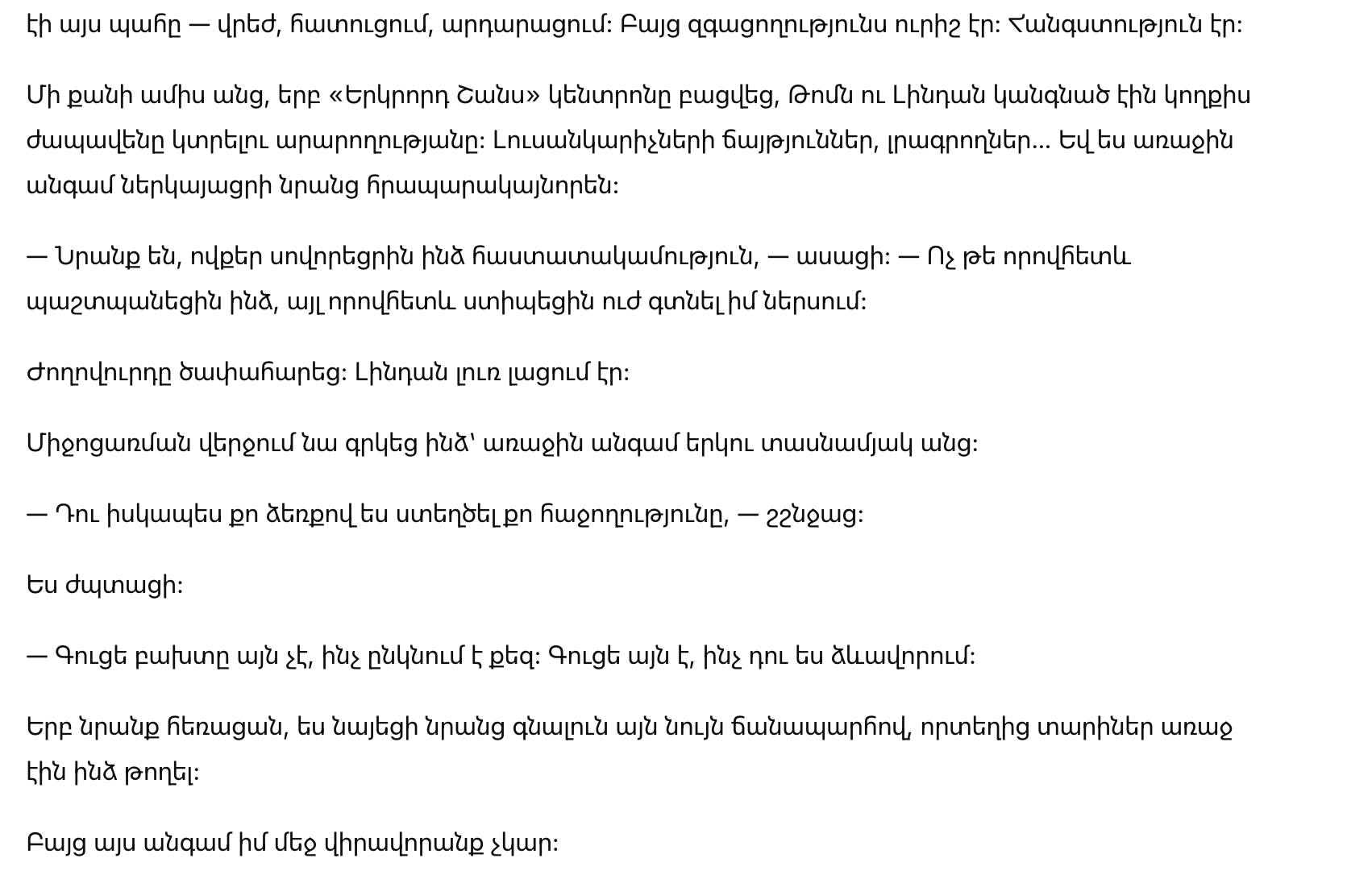 Однажды после обеда я обнаружил Тома одного, когда у него был перерыв. Его руки слегка дрожали, пока он курил, взгляд его был устремлен вдаль.