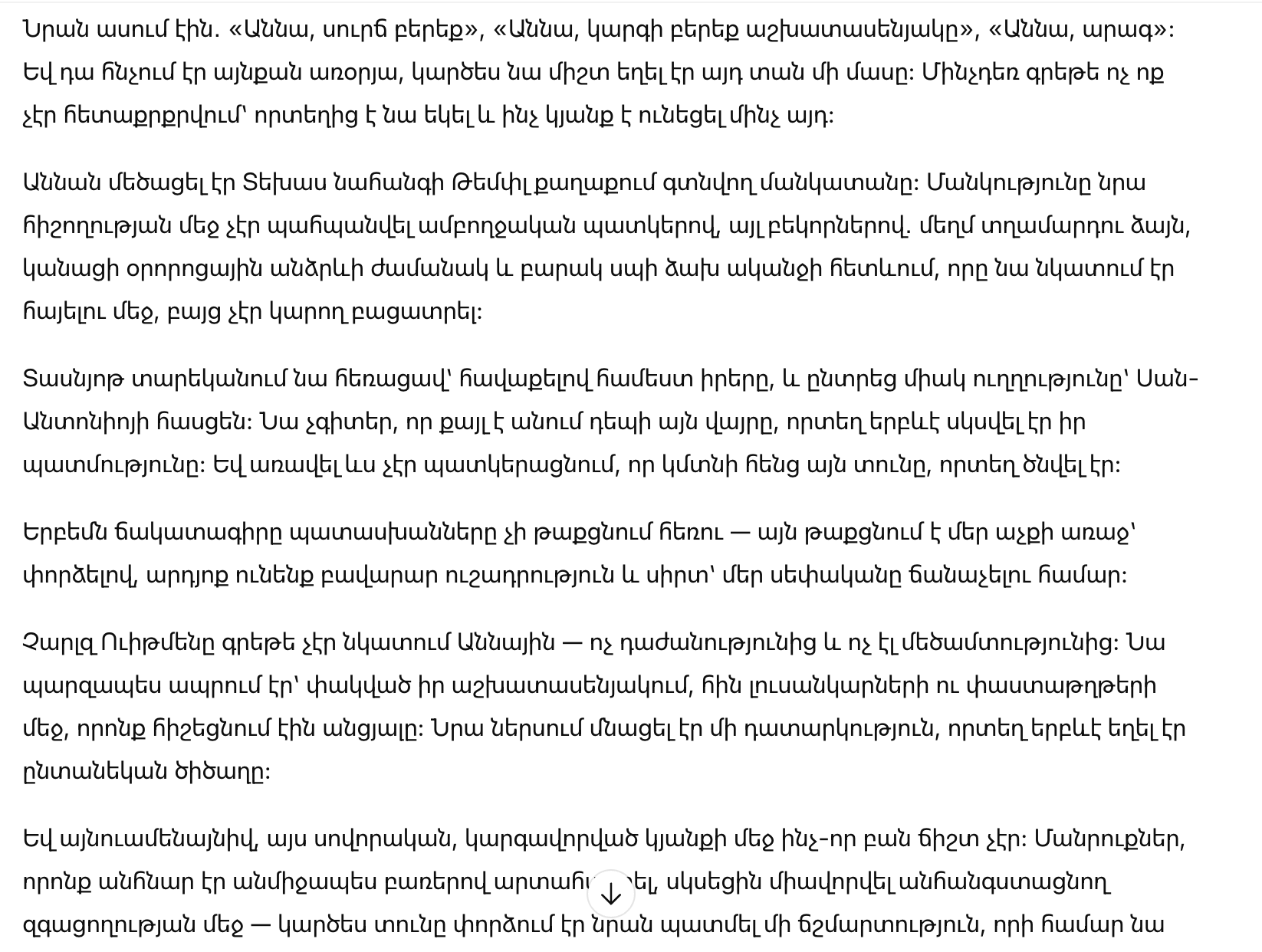 Анна выросла в приюте в городе Темпл, Техас. Детство хранилось в её памяти не целой картиной, а обрывками: мягкий мужской голос, женская колыбельная во время дождя и тонкий шрам за левым ухом, который она замечала в зеркале, но не могла объяснить.