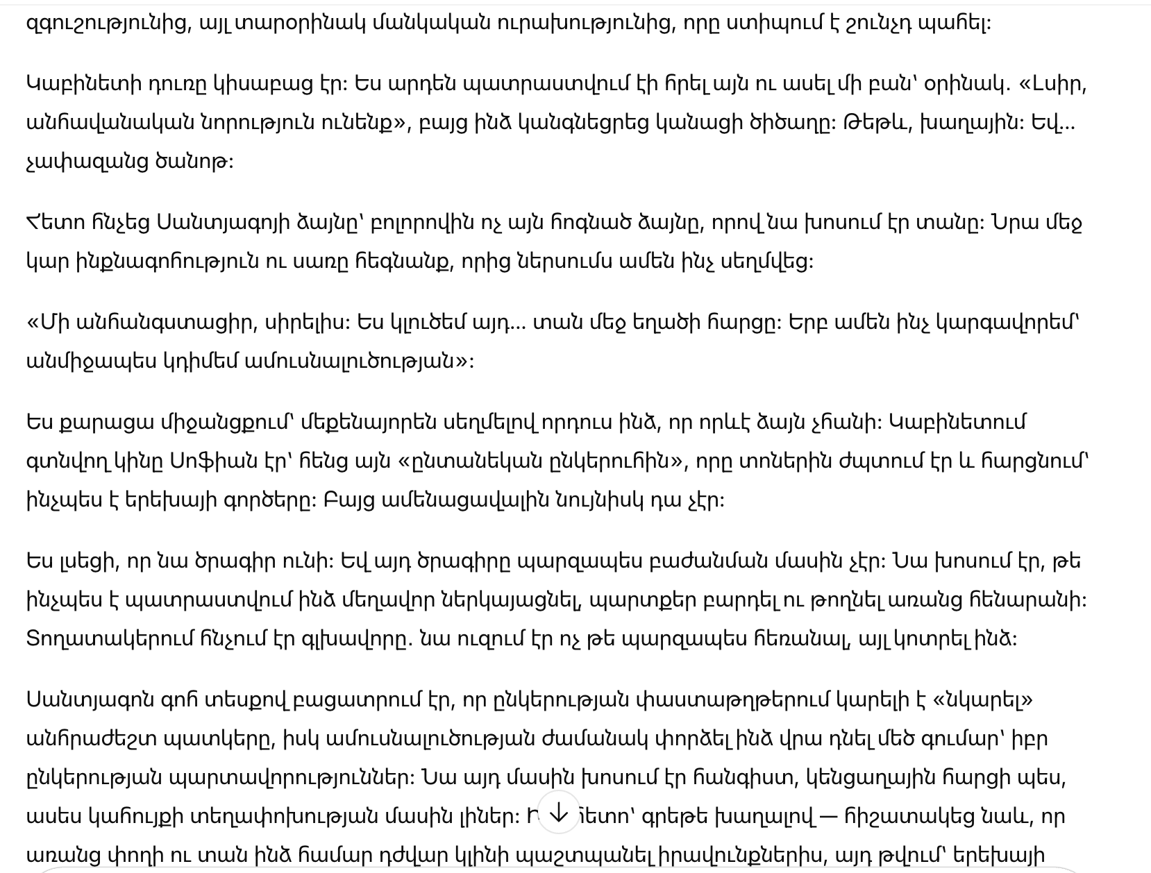 Сантьяго с довольным видом объяснял, что в документах компании можно «нарисовать» нужную картину, а в разводе попытаться повесить на меня внушительную сумму — якобы обязательства фирмы. Он рассуждал об этом спокойно, как о бытовом вопросе, словно говорил о перестановке мебели. А потом — почти играючи — упомянул и про то, что без денег и жилья мне будет сложнее отстаивать свои права, в том числе и в вопросах, связанных с ребёнком.