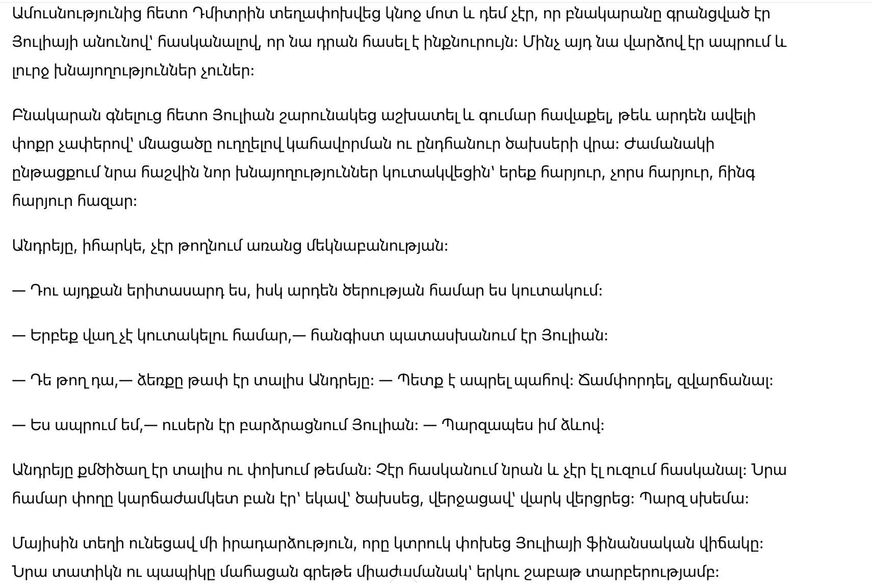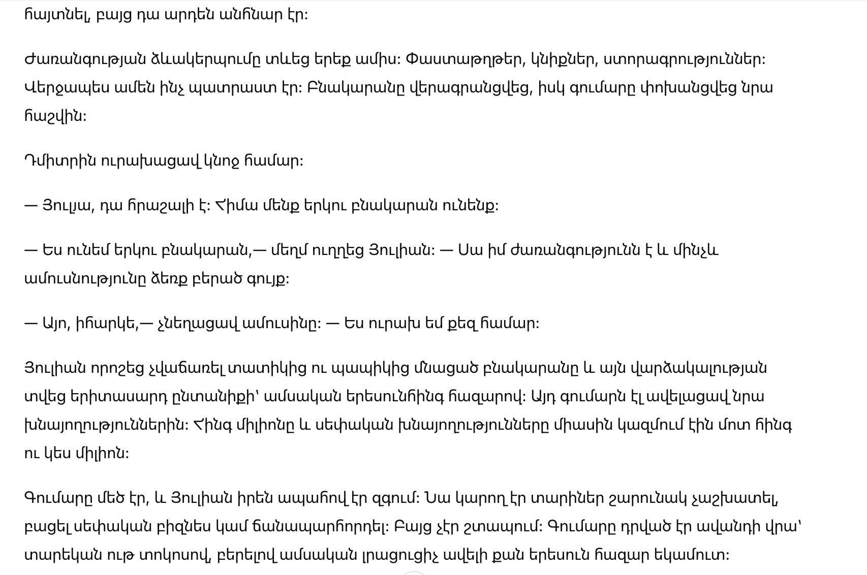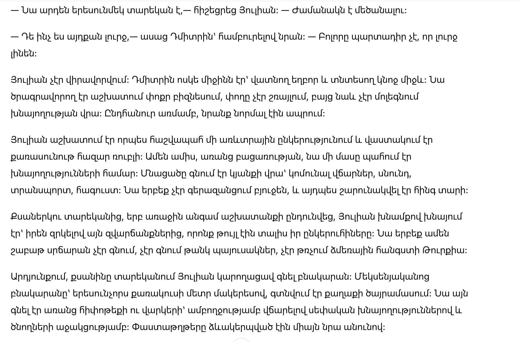 В результате в возрасте двадцати девяти лет Юлия смогла купить квартиру. Однокомнатная квартира площадью тридцать четыре квадратных метров находилась на краю города. Она приобрела её без ипотеки и кредитов, оплатив полностью своими вкладми, плюс поддержка родителей. Документы были оформлены только на её имя.