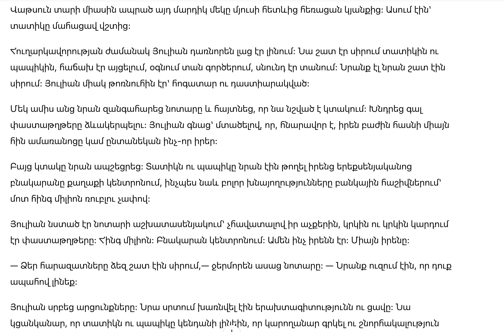 Но завещание удивило ее. Бабушка и дедушка оставили ей свою трёхкомнатную квартиру в центре города, а также все свои накопления на банковских счетах, общей суммой около пяти миллионов рублей.