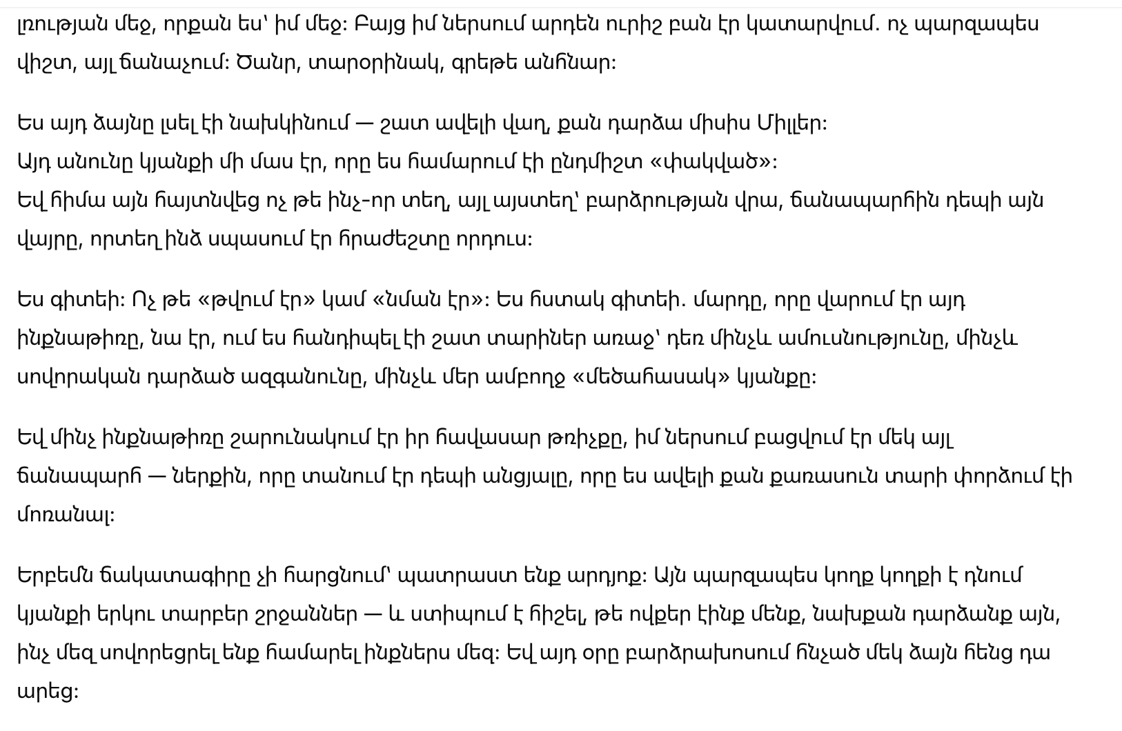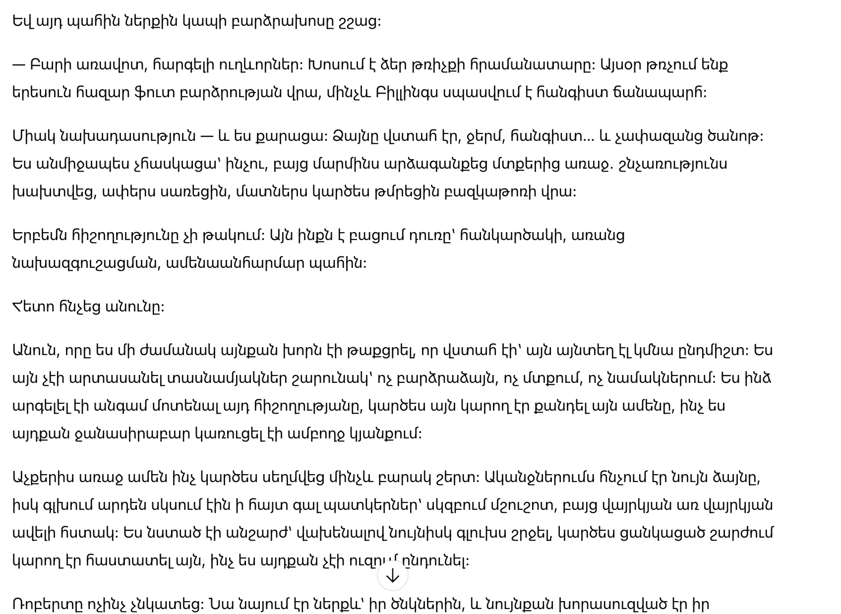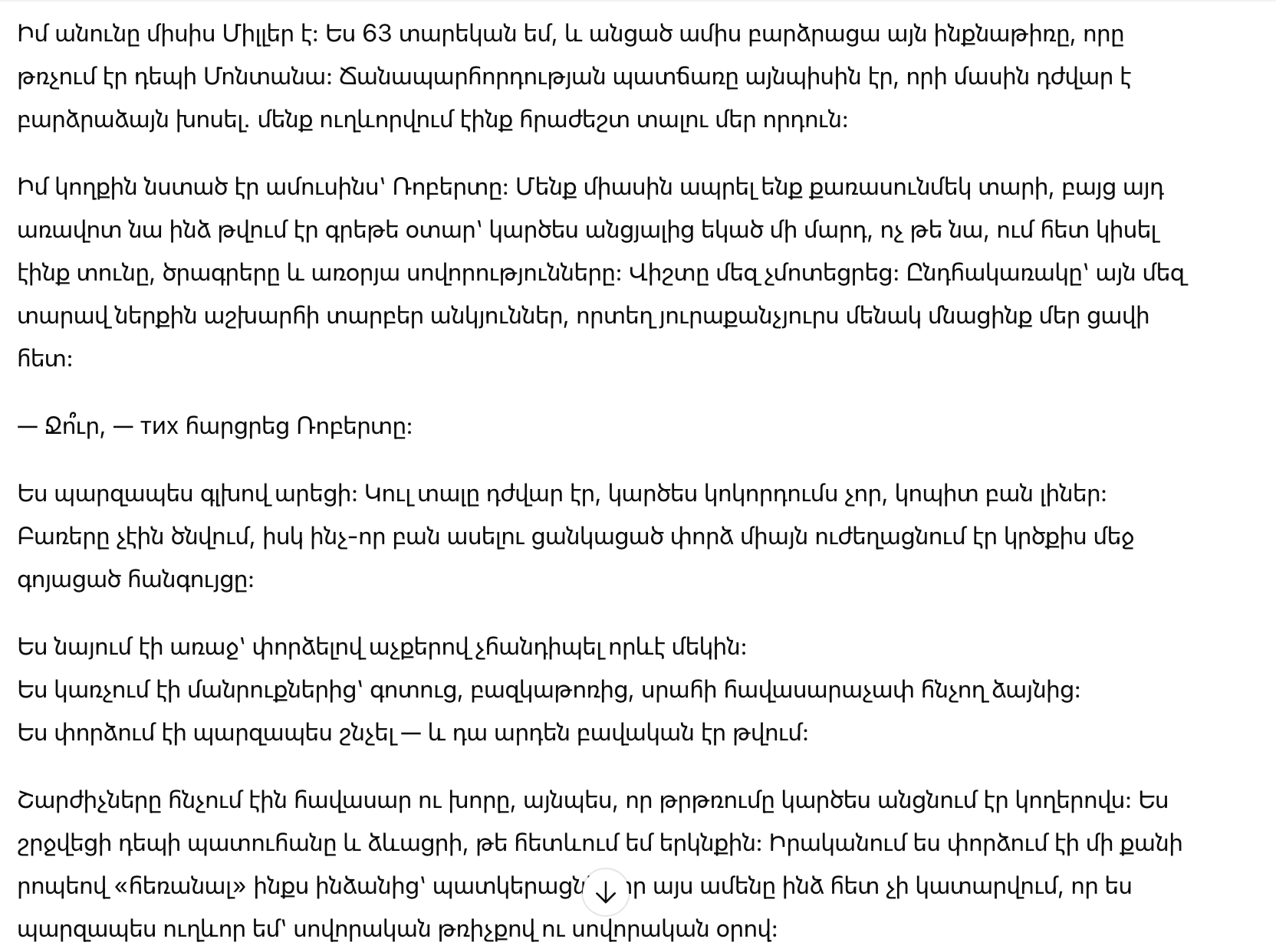 Роберт ничего не заметил. Он смотрел вниз, на свои колени, и был так же погружён в собственную тишину, как и я — в свою. Но во мне уже происходило другое: не просто печаль, а узнавание. Тяжёлое, странное, почти невозможное.