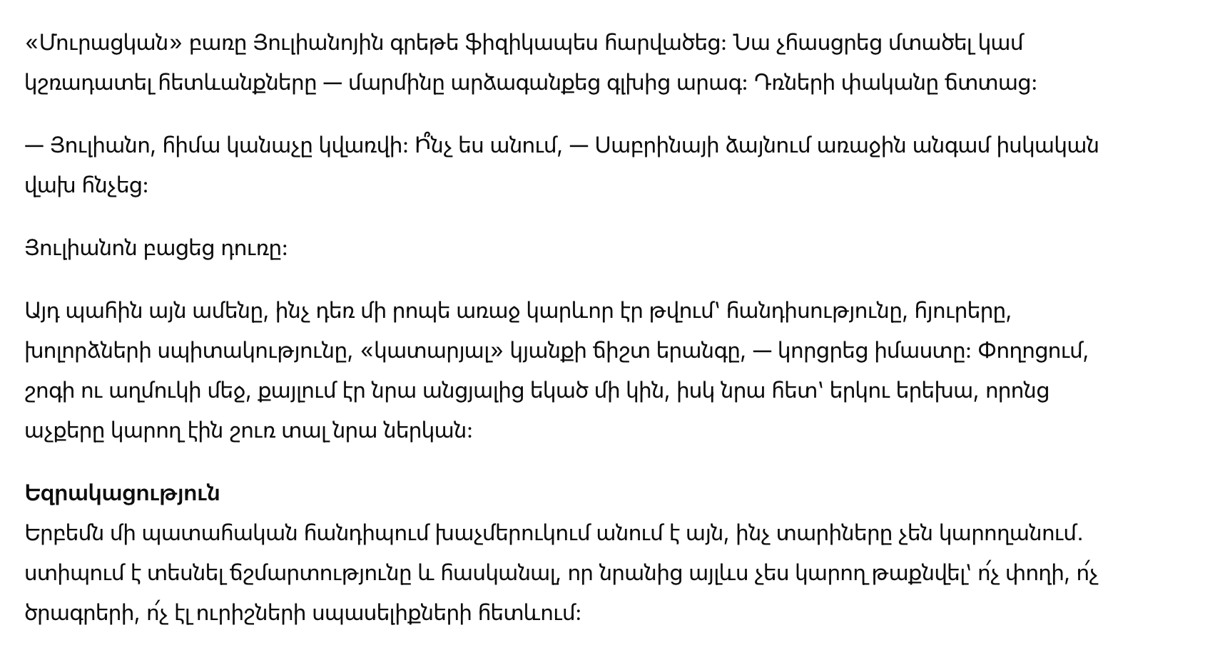 Слово «нищенка» ударило Юлиана почти физически. Он не успел ни обдумать, ни взвесить последствия — тело сработало быстрее головы. Щёлкнул замок дверей.