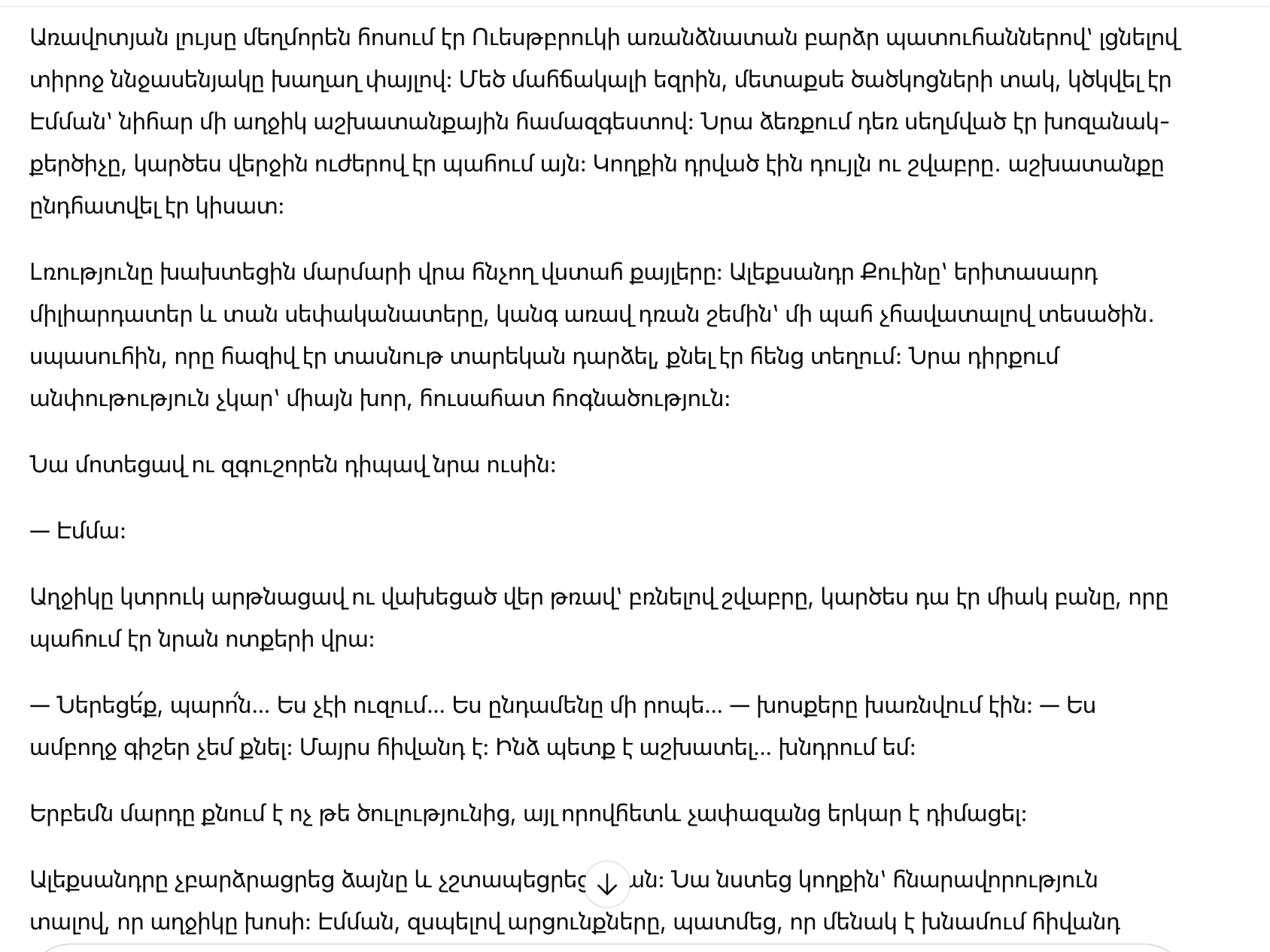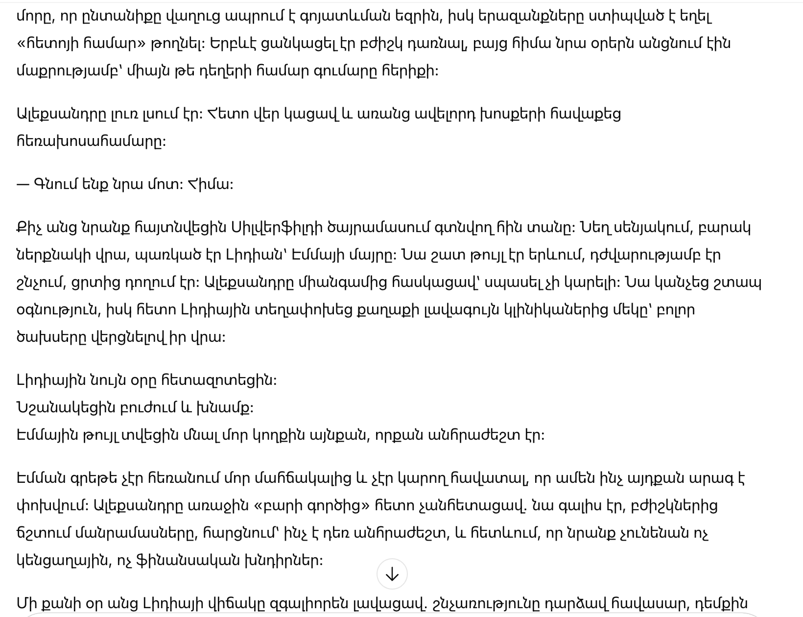 Александр не повысил голос и не стал торопить. Он сел рядом, давая ей возможность выговориться. Эмма, сдерживая слёзы, рассказала, что ухаживает за больной мамой одна, что их семья давно живёт на грани, а мечты пришлось отложить «на потом». Когда-то она хотела стать врачом, но теперь её дни проходили за уборкой — лишь бы хватило на лекарства.