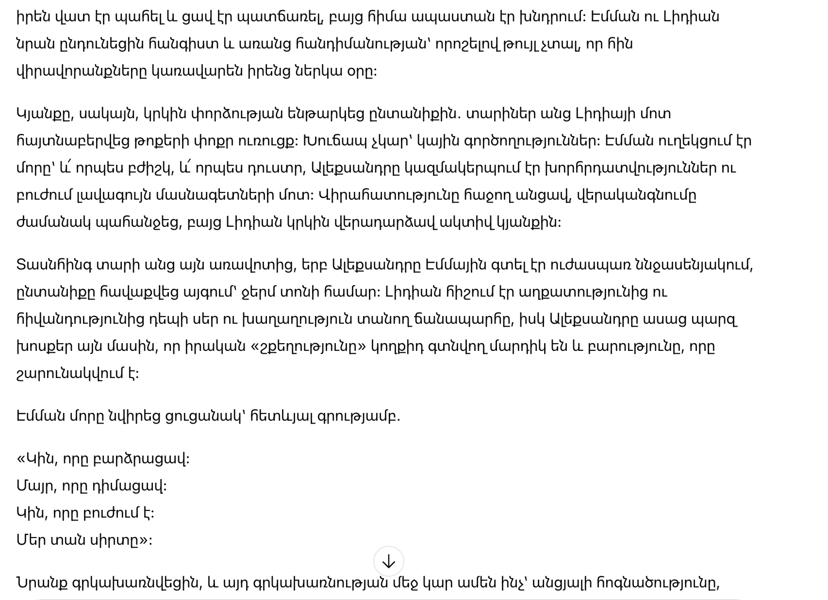 Через пятнадцать лет после того утра, когда Александр нашёл Эмму обессиленной в спальне, семья собралась в саду на тёплый праздник. Лидия вспоминала путь от бедности и болезни к любви и спокойствию, а Александр произнёс простые слова о том, что настоящая «роскошь» — это люди рядом и добро, которое продолжается.