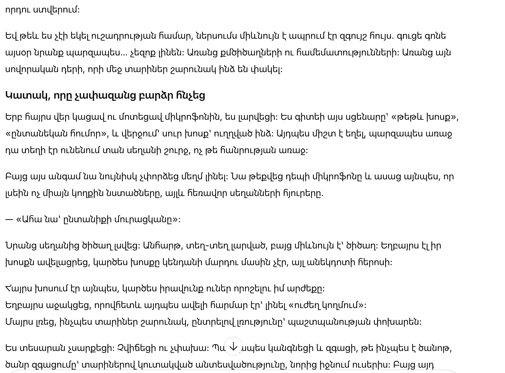 Когда отец поднялся с места и потянулся к микрофону, я напряглась. Я знала этот сценарий: «лёгкая речь», «семейный юмор», а в конце — колкость, направленная в меня. Так было всегда, просто раньше это происходило за домашним столом, а не на публике.