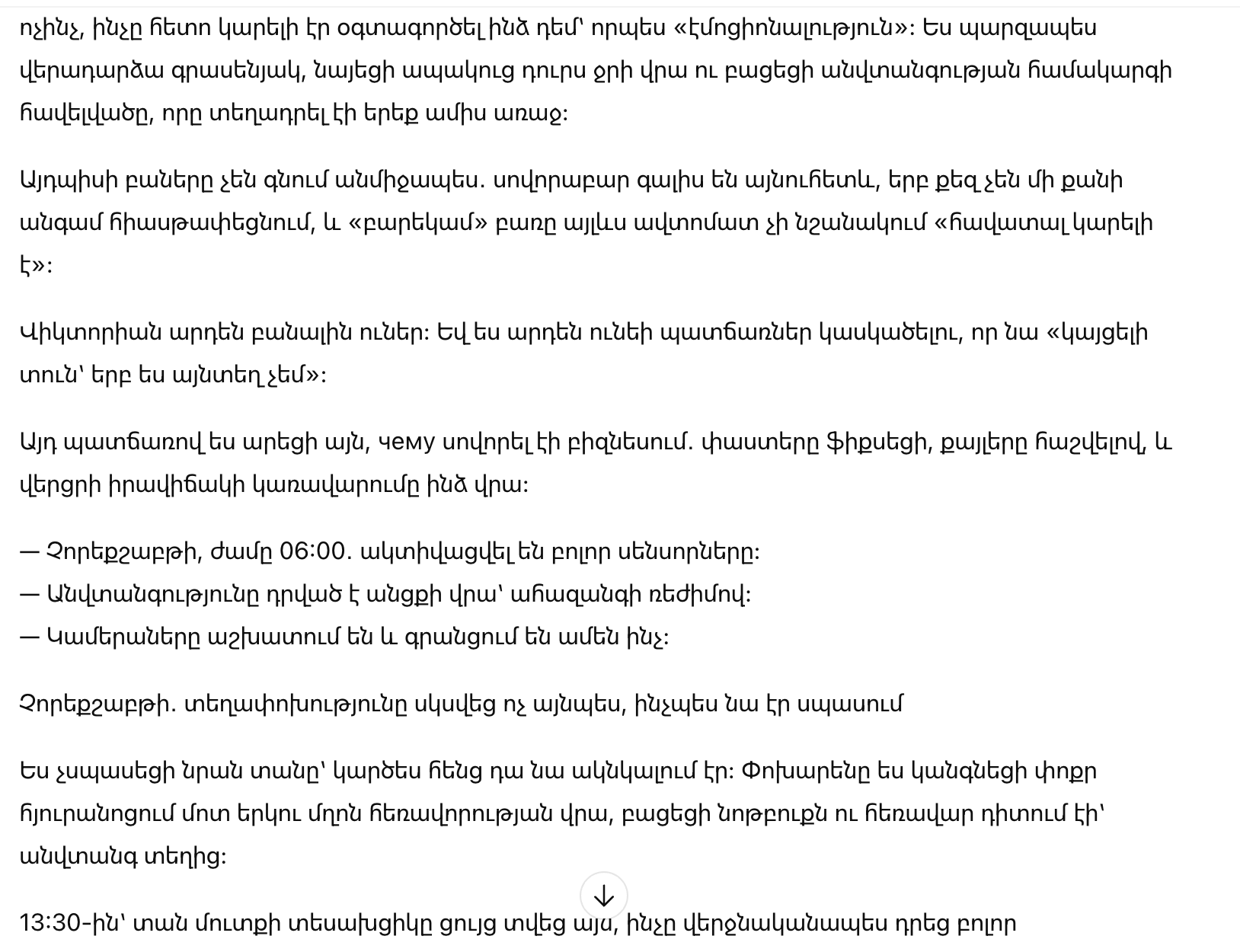 На том бранче я не спорила и не повышала голос. Ни сцены, ни упрёков — ничего, что можно было бы потом использовать против меня как «эмоциональность». Я просто вернулась в офис, посмотрела на дождь за стеклом и открыла приложение системы безопасности, которую установила три месяца назад.