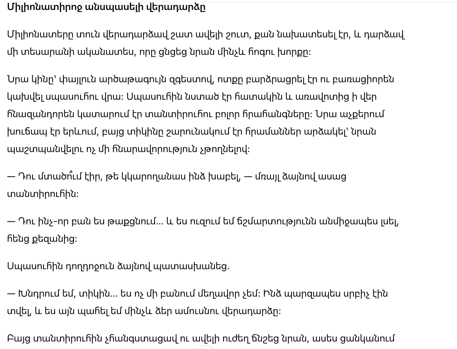 В этот момент в комнату вошел миллионер. Услышав, что происходит, он увидел всё своими глазами и устроил своей жене такую сцену, что она осталась в полном шоке.