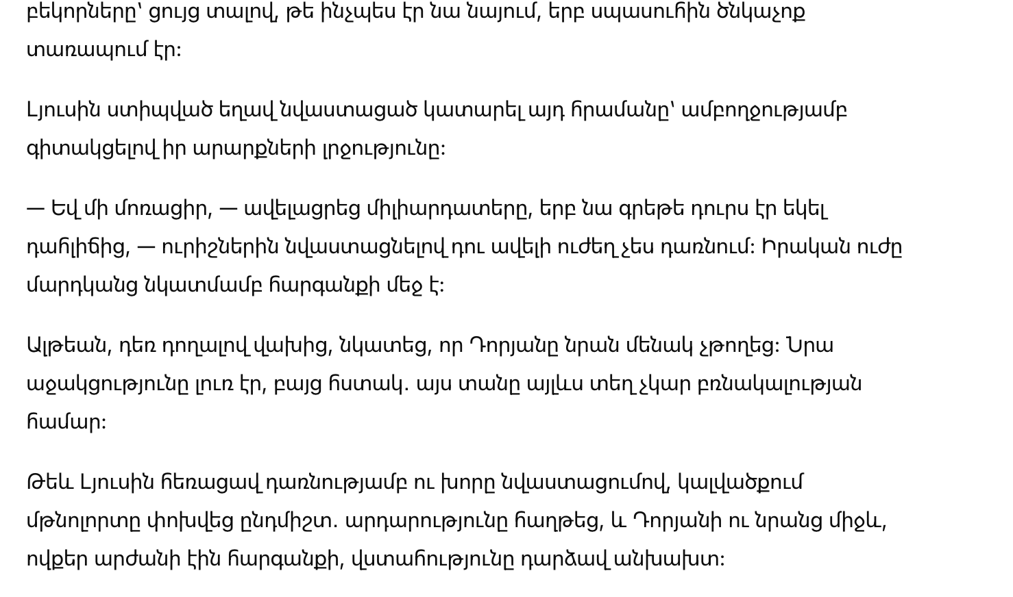 Хотя Lucy ушла с горечью и унижением, атмосфера в усадьбе изменилась навсегда — справедливость восторжествовала, и доверие между Dorian и теми, кто заслуживал уважения, стало непреложным.