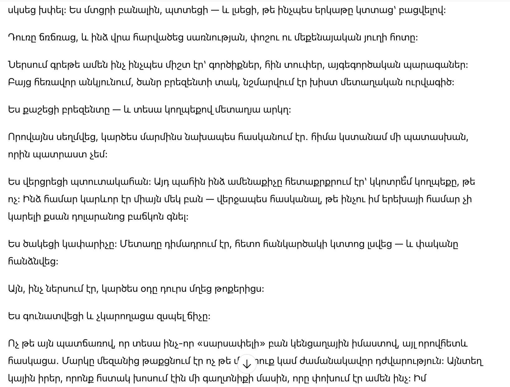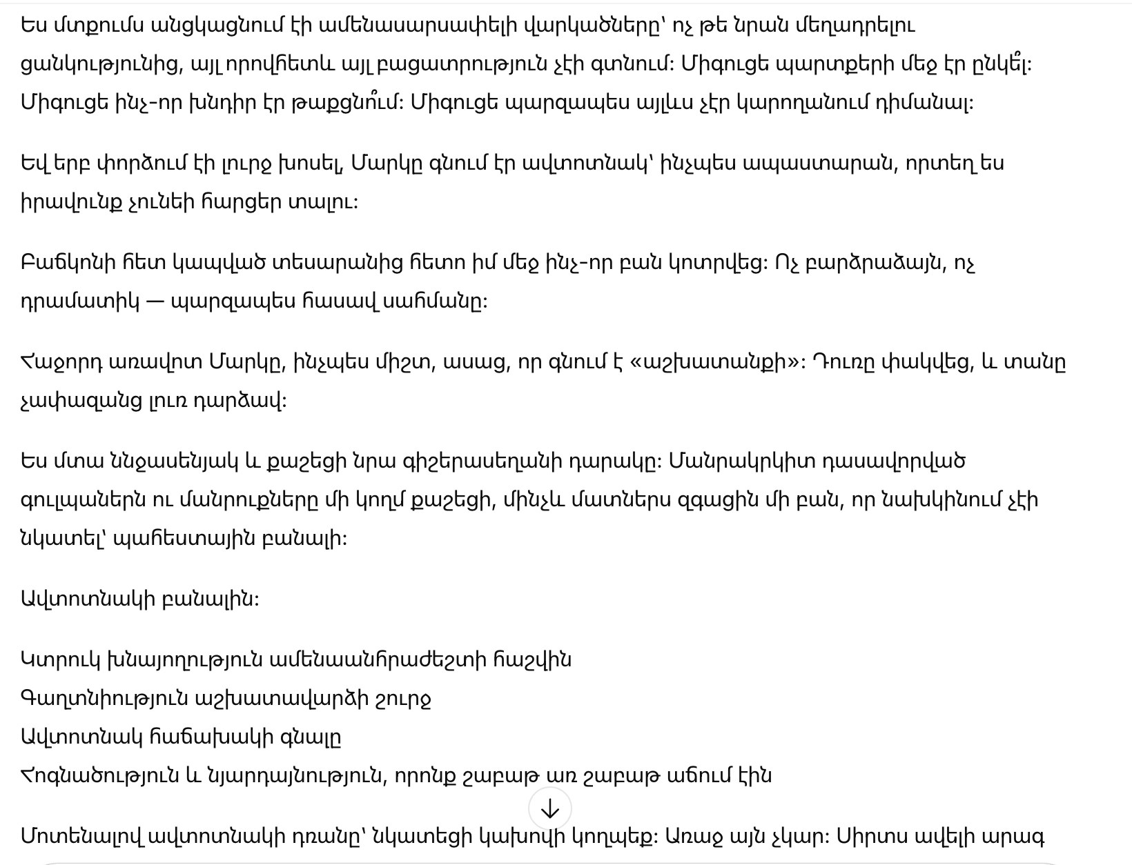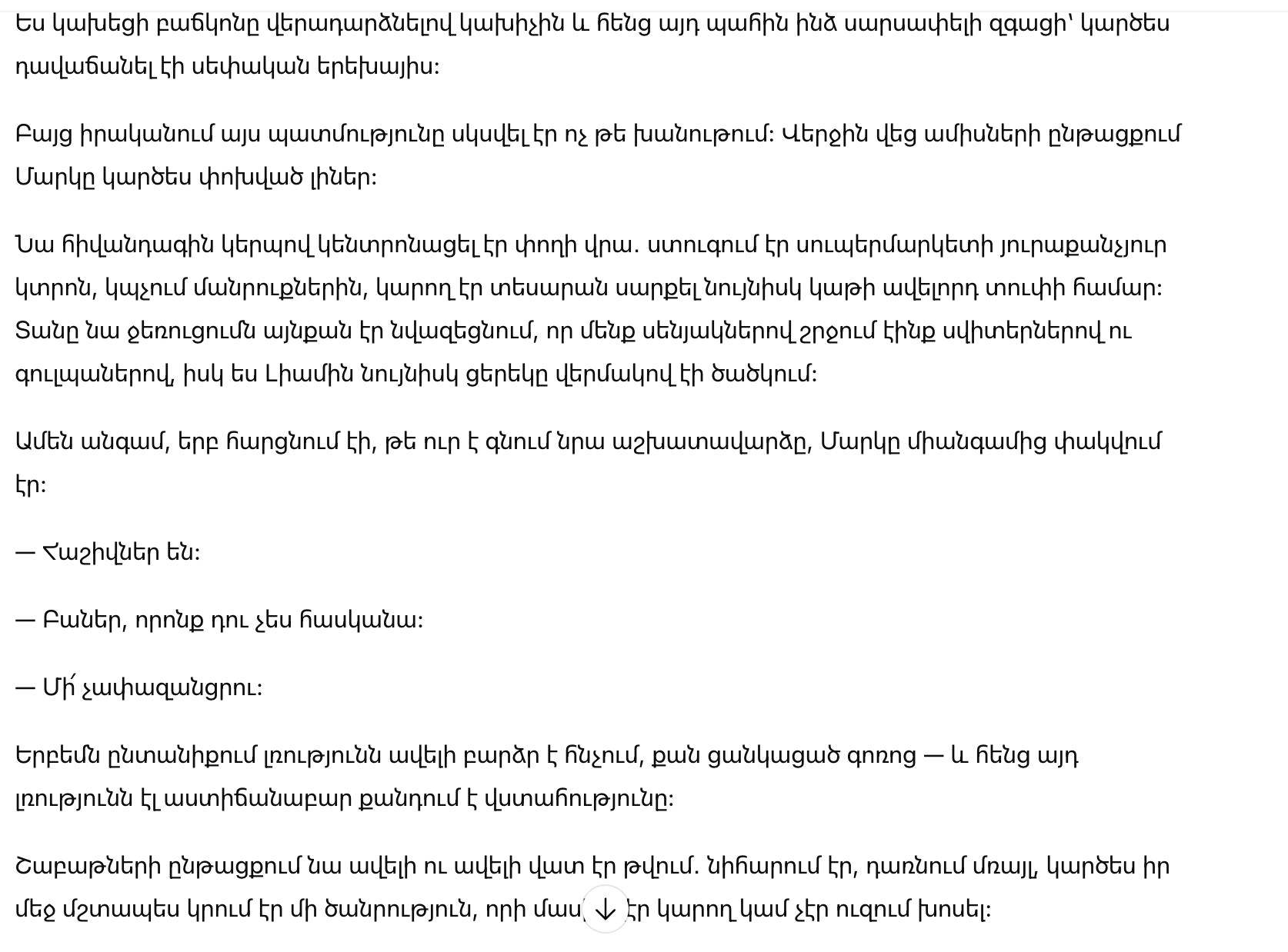 На следующее утро Марк, как обычно, сказал, что уходит «на работу». Дверь закрылась, и в доме стало слишком тихо.