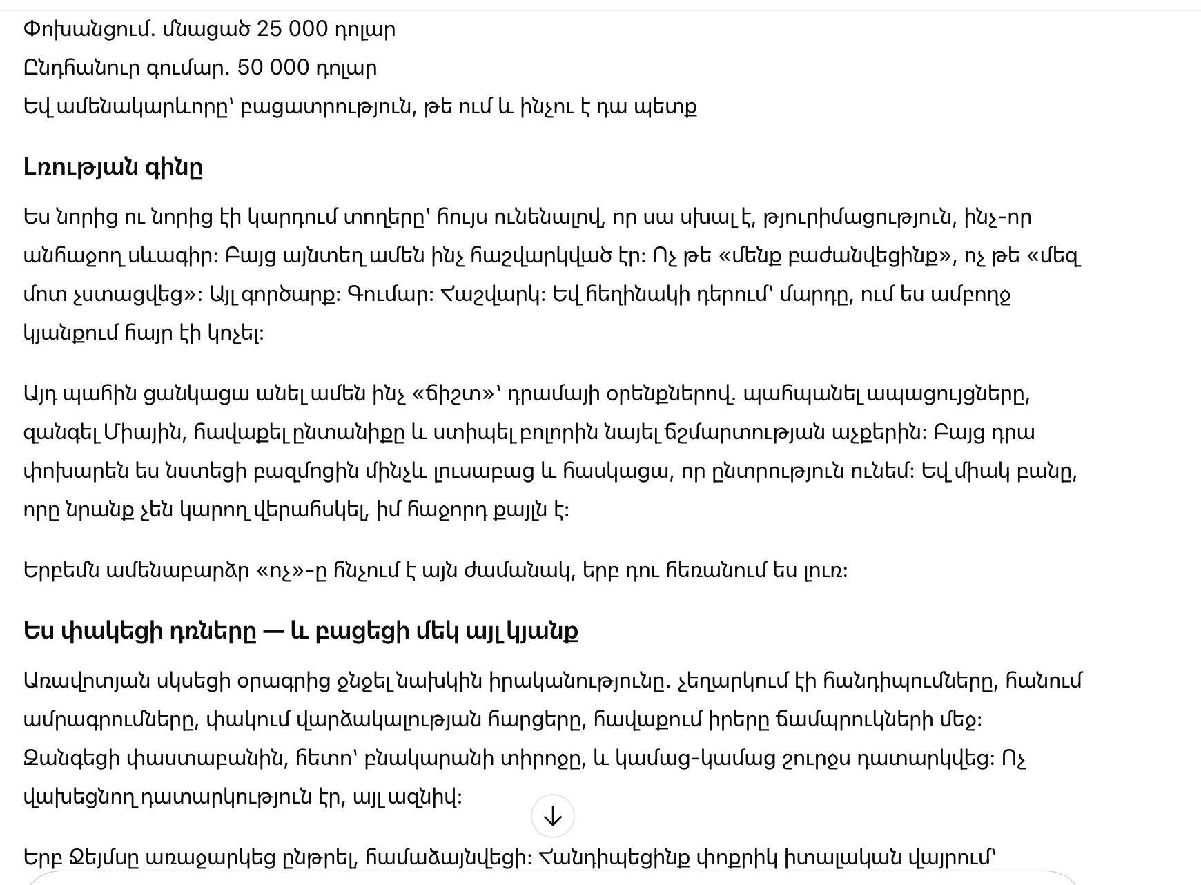 Я перечитывала строки снова и снова, надеясь, что это ошибка, недоразумение, чей-то неудачный черновик. Но там всё было выверено. Не «мы расстались», не «у нас не получилось». А сделка. Сумма. Расчёт. И в роли автора — человек, которого я всю жизнь называла папой.