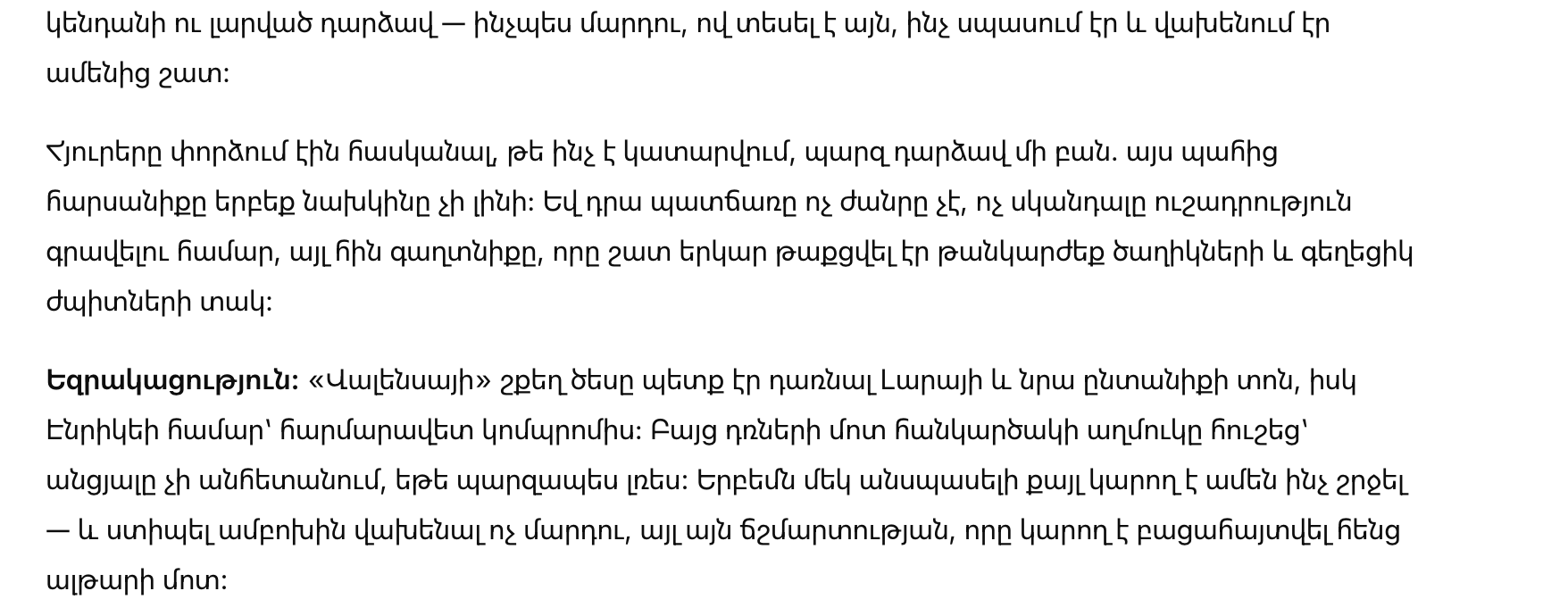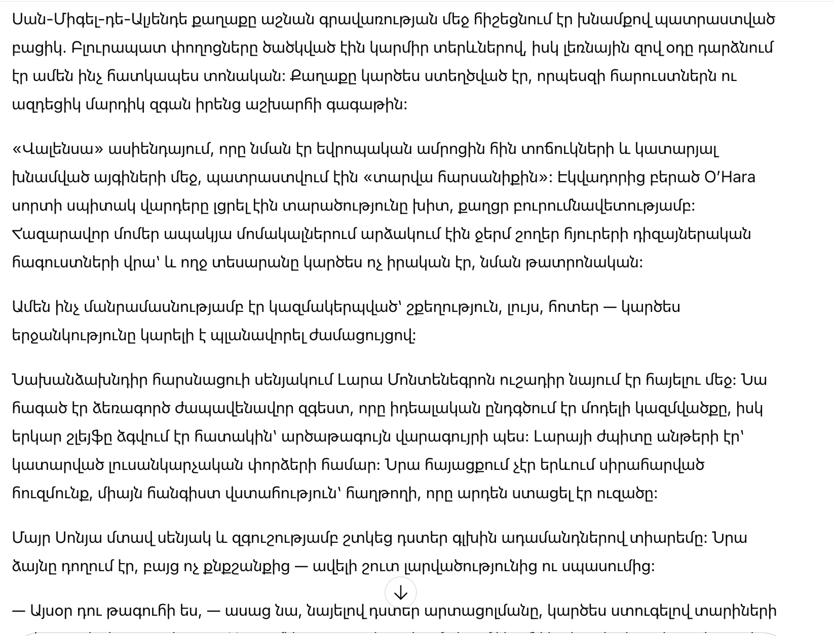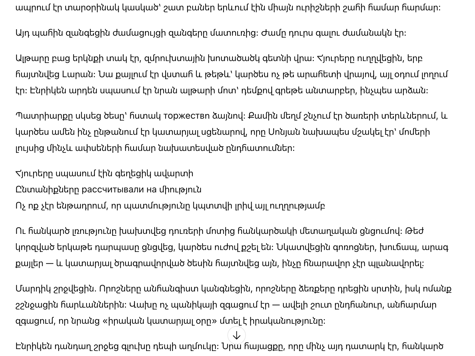 Алтарь под открытым небом стоял на изумрудном газоне. Гости выпрямились, когда появилась Лара. Она шла уверенно и легко, будто не шагала по дорожке, а скользила по воздуху. Энрике уже ждал ее у алтаря — с лицом почти без выражения, как у статуи.