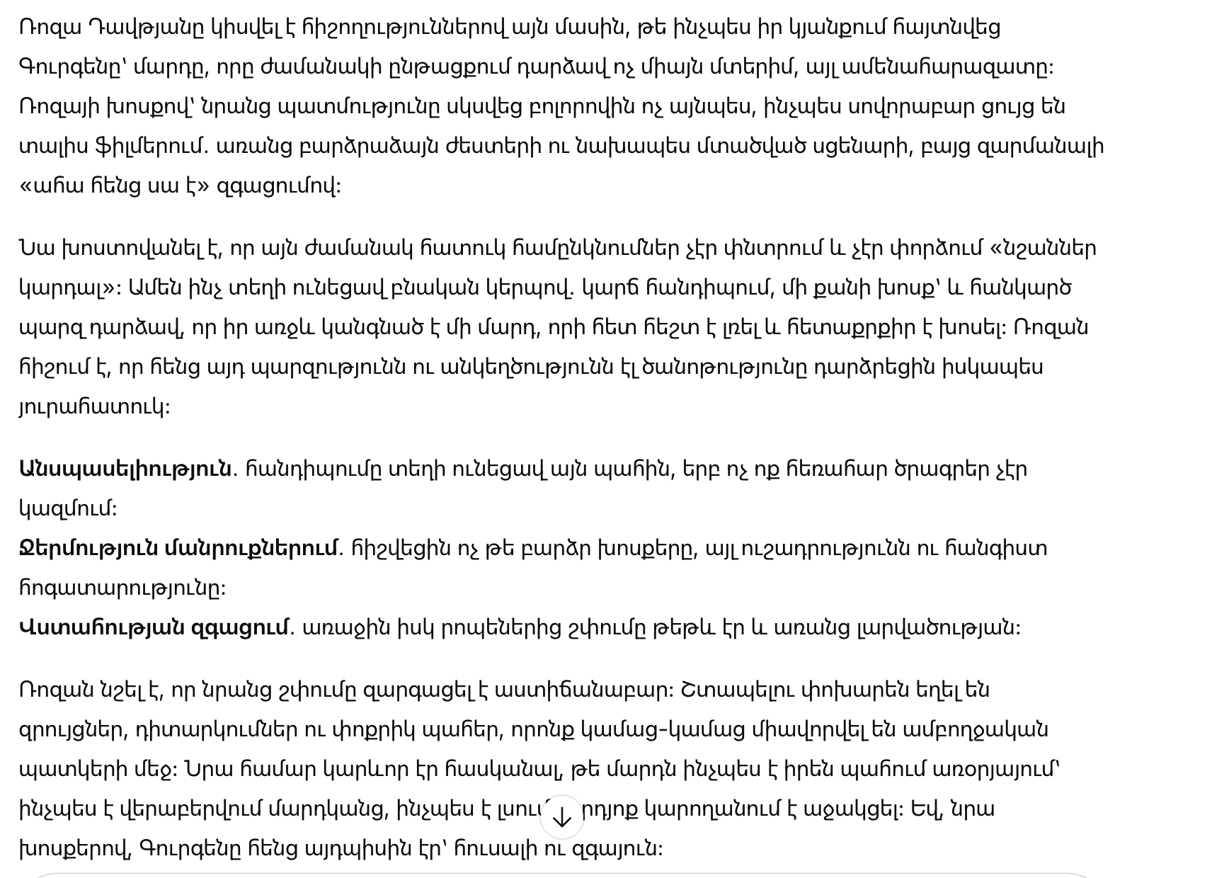 Роза отметила, что их общение развивалось постепенно. Вместо спешки были разговоры, наблюдения и маленькие моменты, которые складывались в цельную картину. Ей было важно понять, как человек ведёт себя в обычной жизни: как относится к людям, как слушает, умеет ли поддержать. И Гурген, по её словам, оказался именно таким — надёжным и чутким.