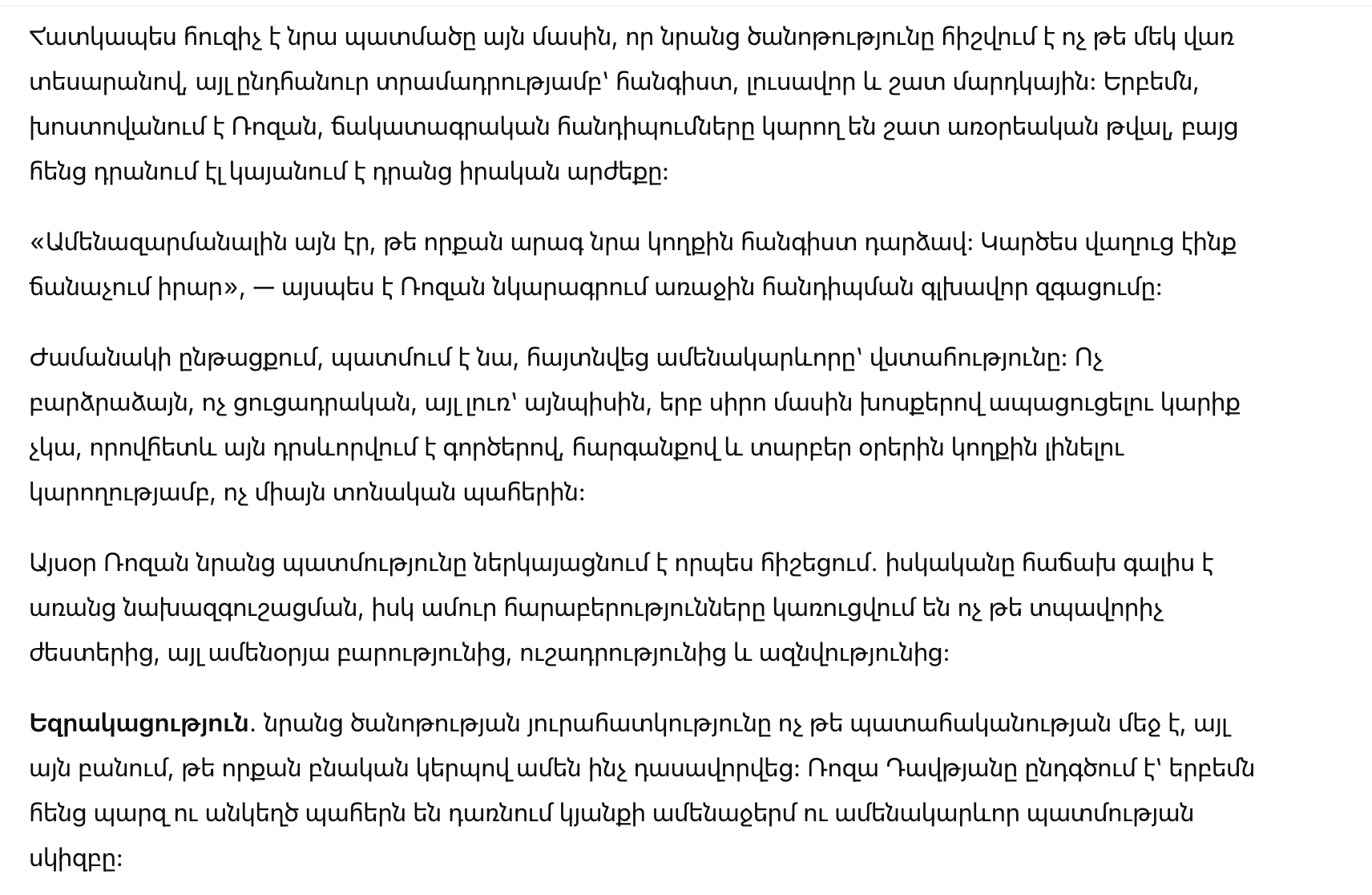 Итог: необычность их знакомства — не в случайности, а в том, как естественно всё сложилось. Роза Давтян подчёркивает: именно простые, искренние моменты иногда становятся началом самой тёплой и важной истории в жизни.