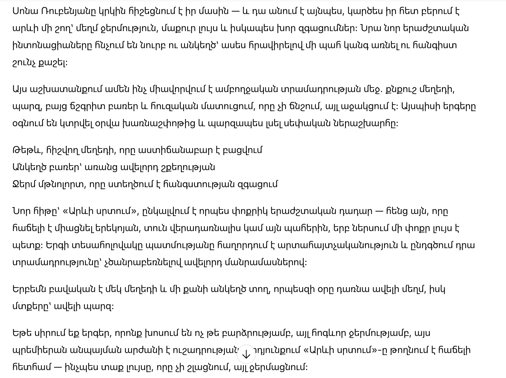 Сона Рубенян снова напоминает о себе — и делает это так, будто приносит с собой луч солнца: мягкое тепло, чистый свет и по-настоящему глубокие чувства. Её новые музыкальные интонации звучат деликатно и искренне, словно приглашая ненадолго остановиться и выдохнуть.