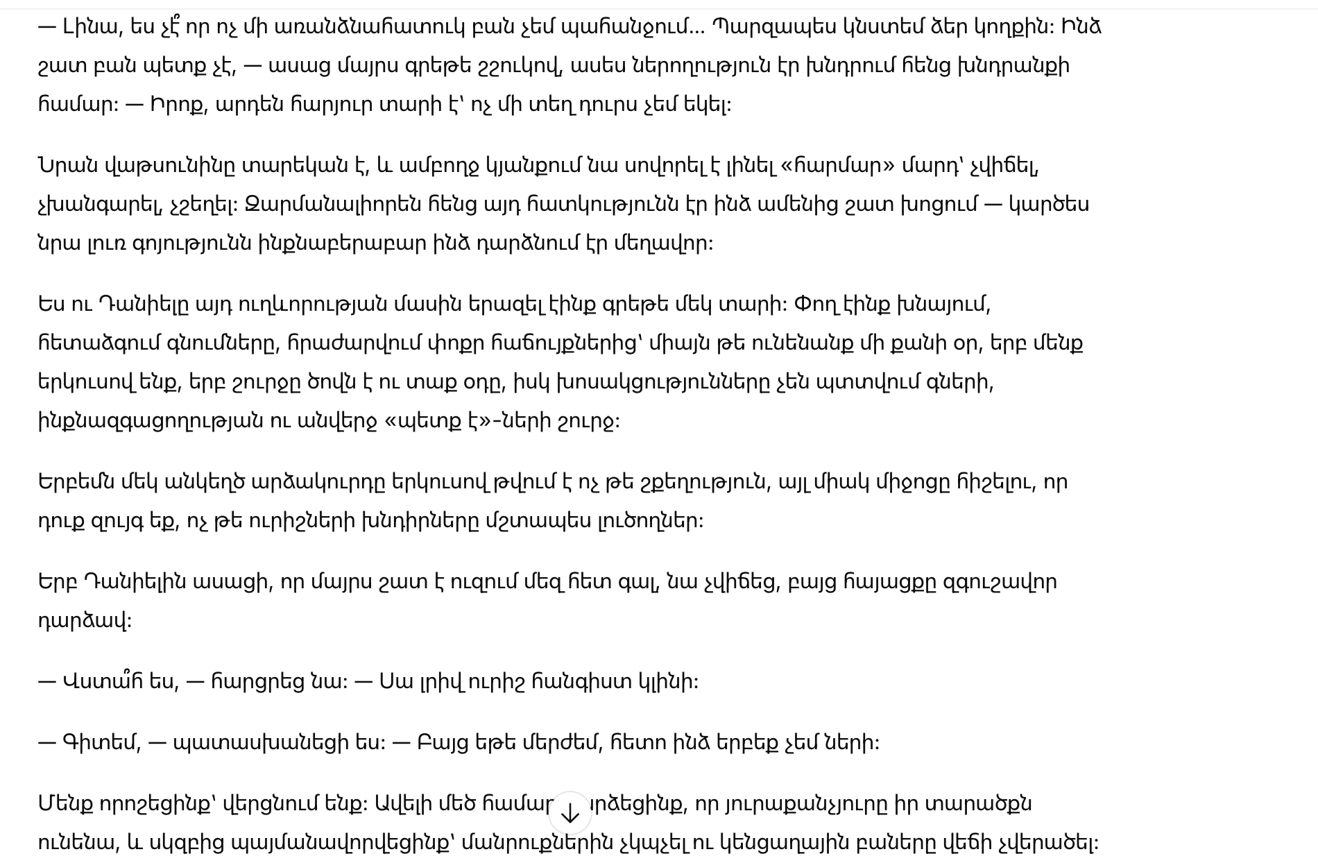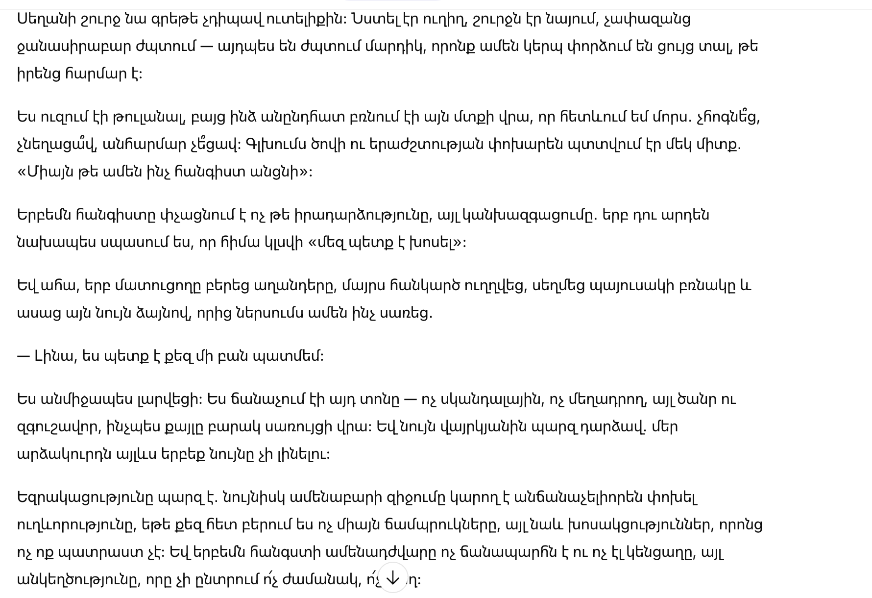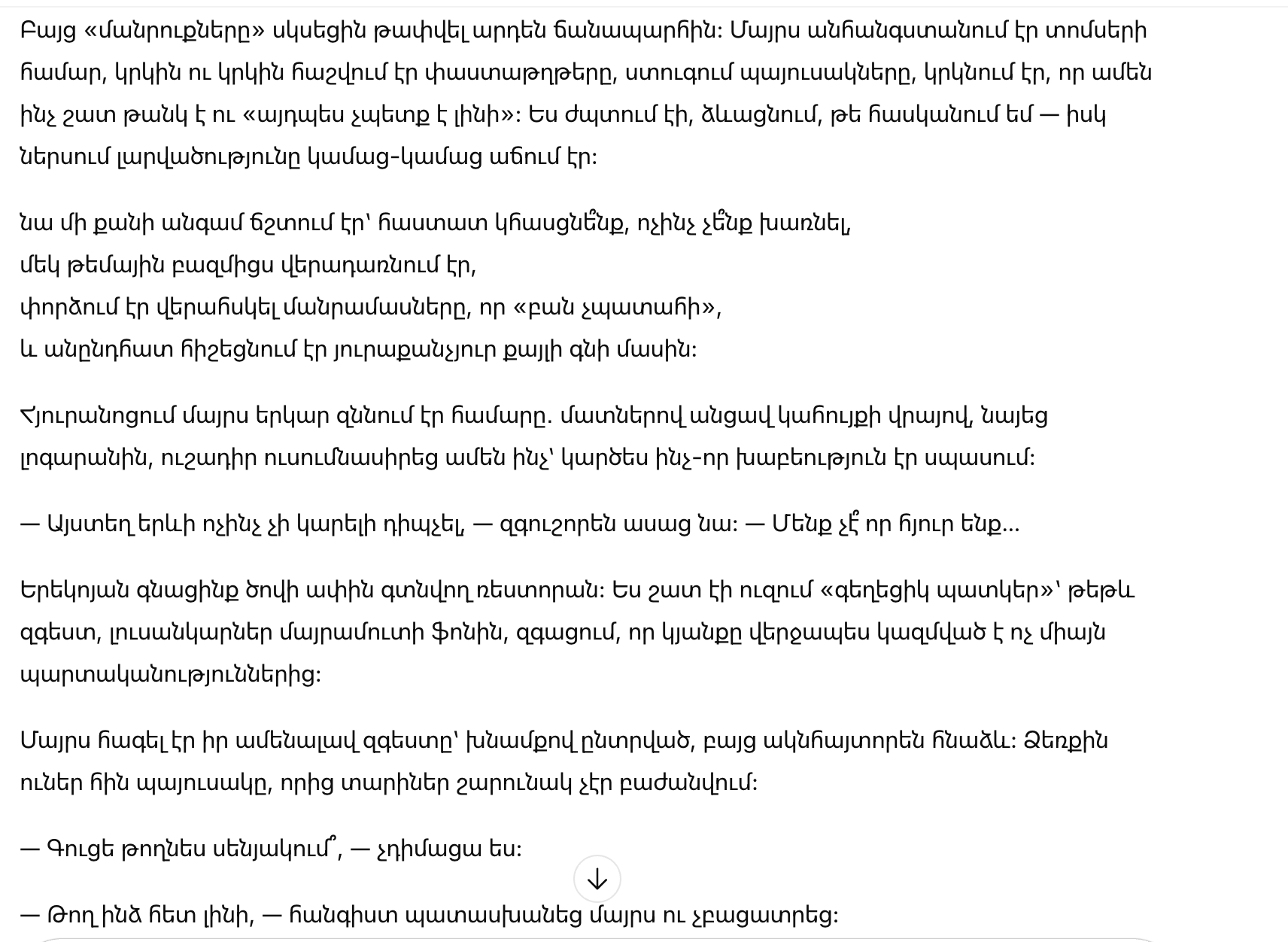 И вот, когда официант принёс десерт, мама вдруг выпрямилась, сжала ручку своей сумки и сказала тем самым голосом, от которого у меня внутри всё похолодело: