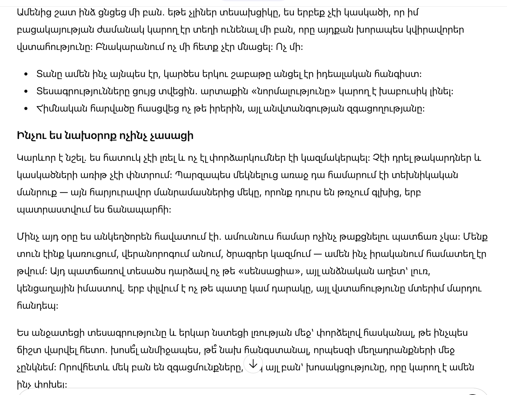 Меня поразило прежде всего одно: если бы не камера, я бы никогда не заподозрила, что в моё отсутствие могло происходить что-то, способное так сильно ранить доверие. В квартире не осталось никаких следов. Никаких.