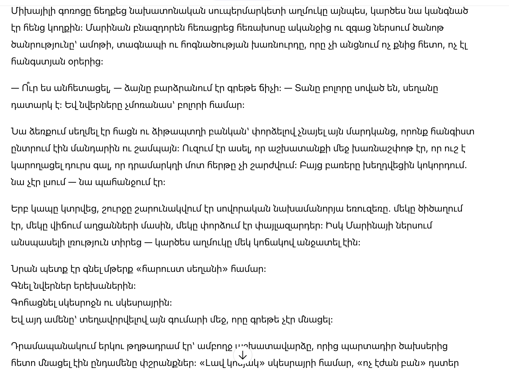 Она сжала в руках хлеб и банку оливок, стараясь не смотреть на людей, которые спокойно выбирали мандарины и шампанское. Ей хотелось сказать, что на работе был аврал, что она вырвалась поздно, что очередь на кассе не двигается. Но слова застряли: он не слушал — он требовал.