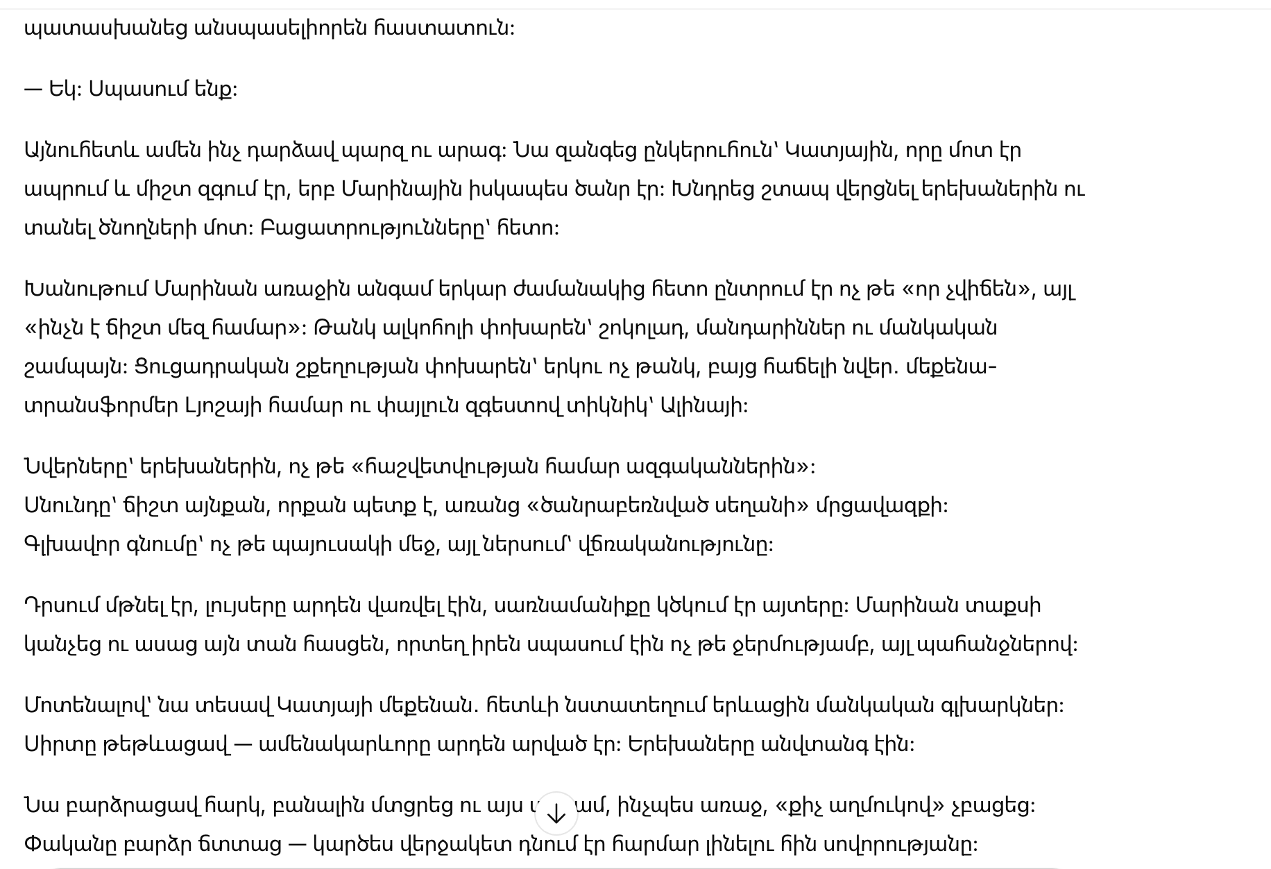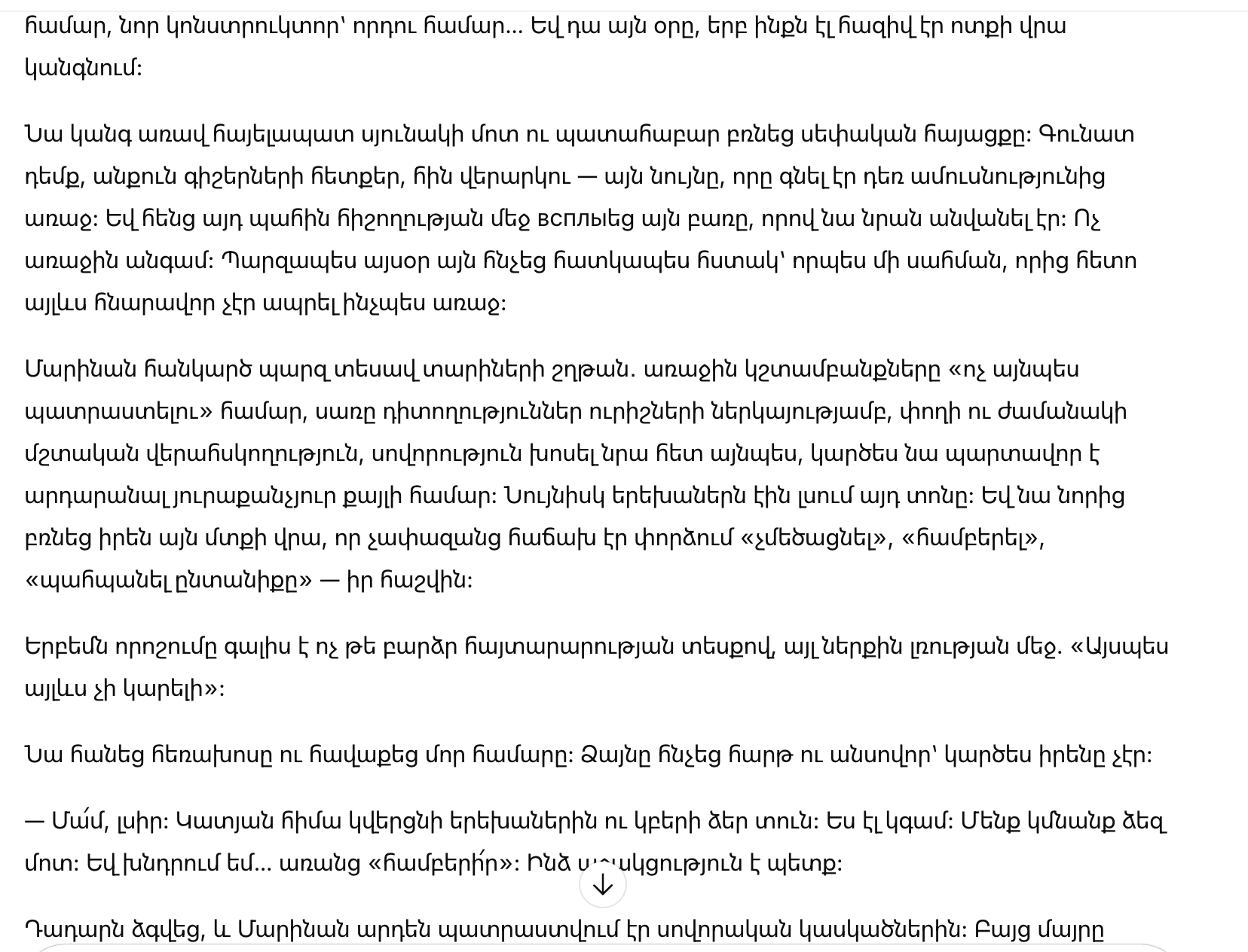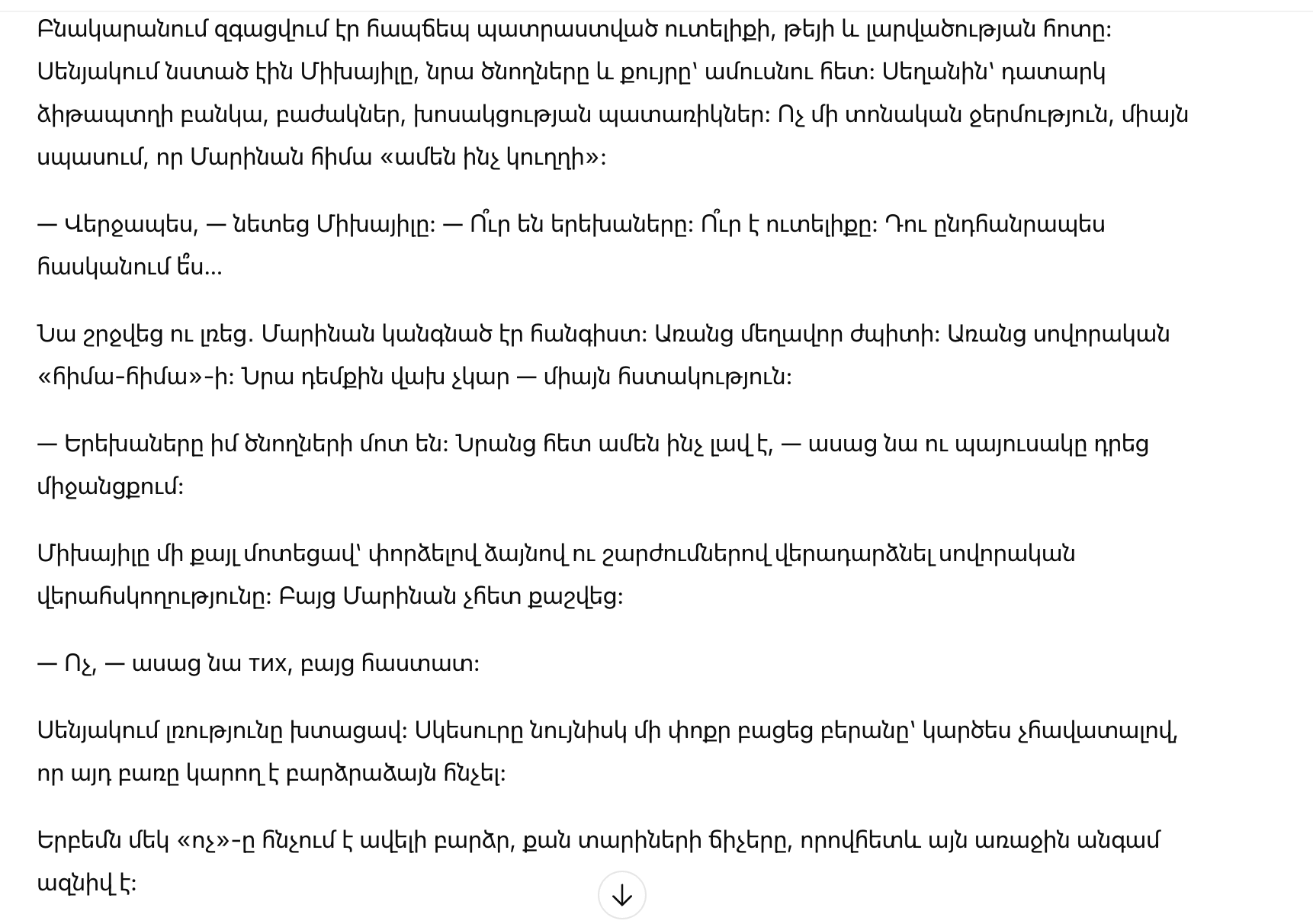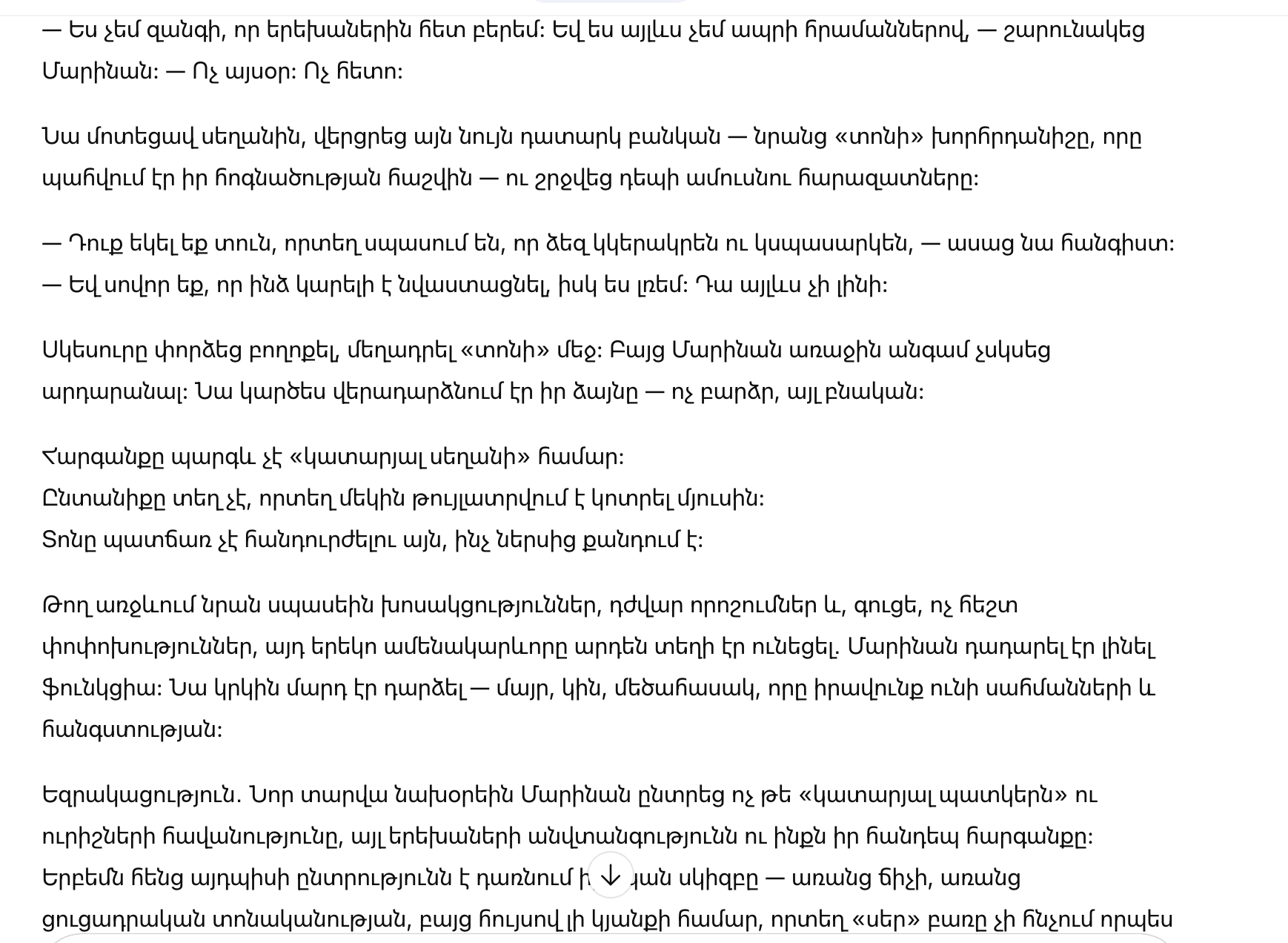 Марина вдруг ясно увидела цепочку лет: первые упреки из-за «не так приготовленного», холодные замечания при чужих, постоянный контроль денег и времени, привычка говорить с ней так, словно она обязана оправдываться за любое движение. Даже дети слышали этот тон. И она снова поймала себя на мысли, что слишком часто старалась «не раздувать», «потерпеть», «сохранить семью» — ценой себя.