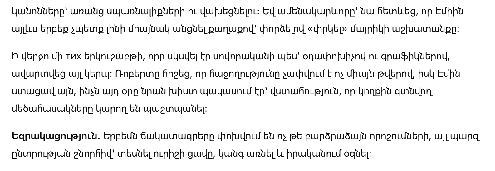 Эми всхлипывала и повторяла, что «мама будет расстроена» и что «они не выдержат, если её уволят». Тогда Роберт сел рядом и сказал то, чего девочка явно ожидала меньше всего: