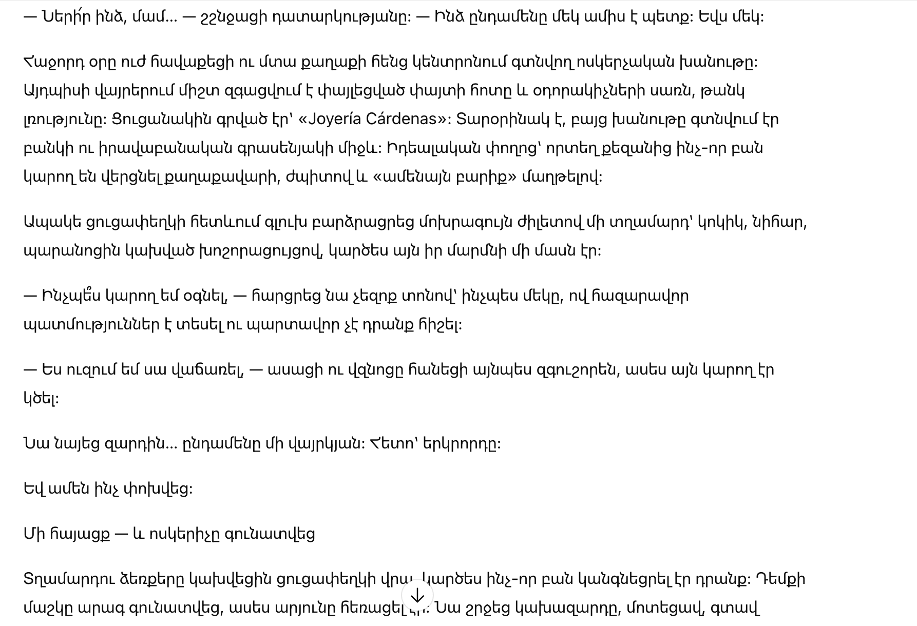 На следующий день я собралась с духом и зашла в ювелирный магазин в самом центре. В таких местах всегда пахнет полированным деревом и дорогим холодом кондиционеров. На вывеске значилось: «Joyería Cárdenas». Забавно — магазин стоял между банком и юридической конторой. Идеальная улица, чтобы у тебя что-то забрали вежливо, с улыбкой и «всего хорошего».