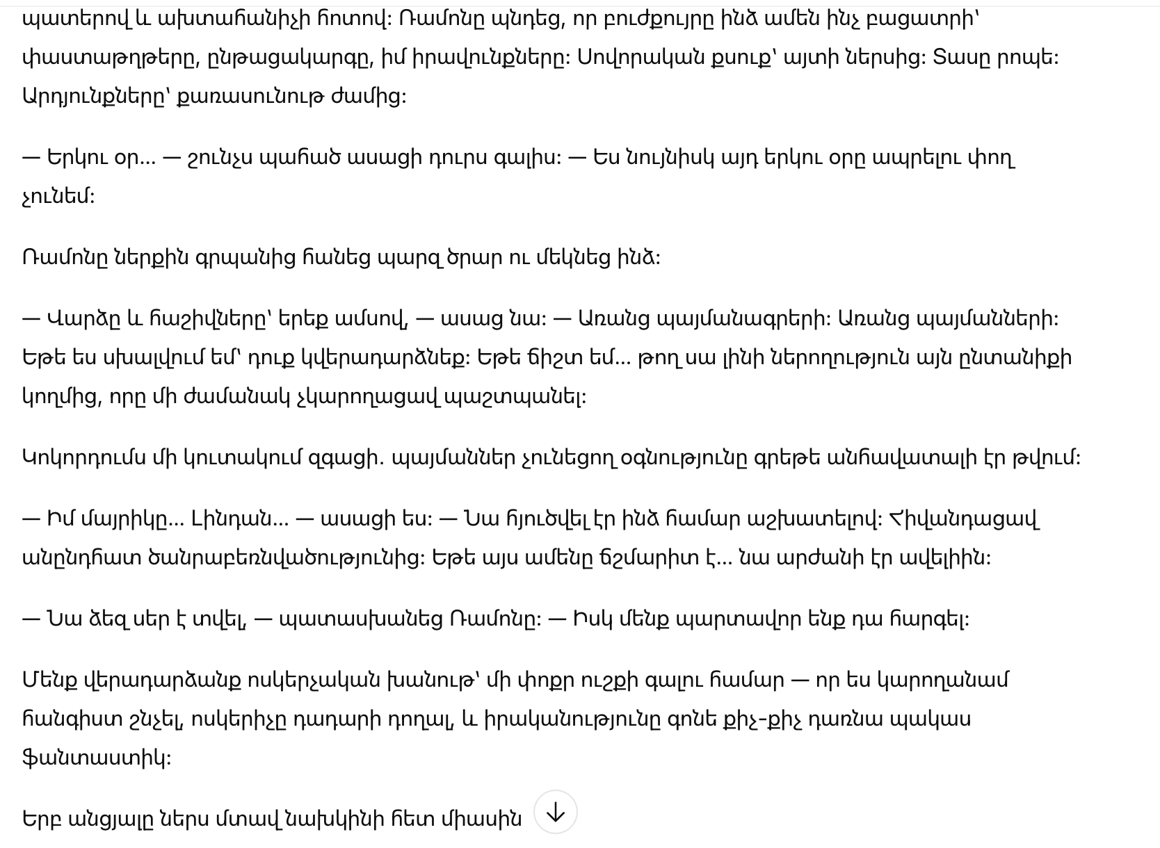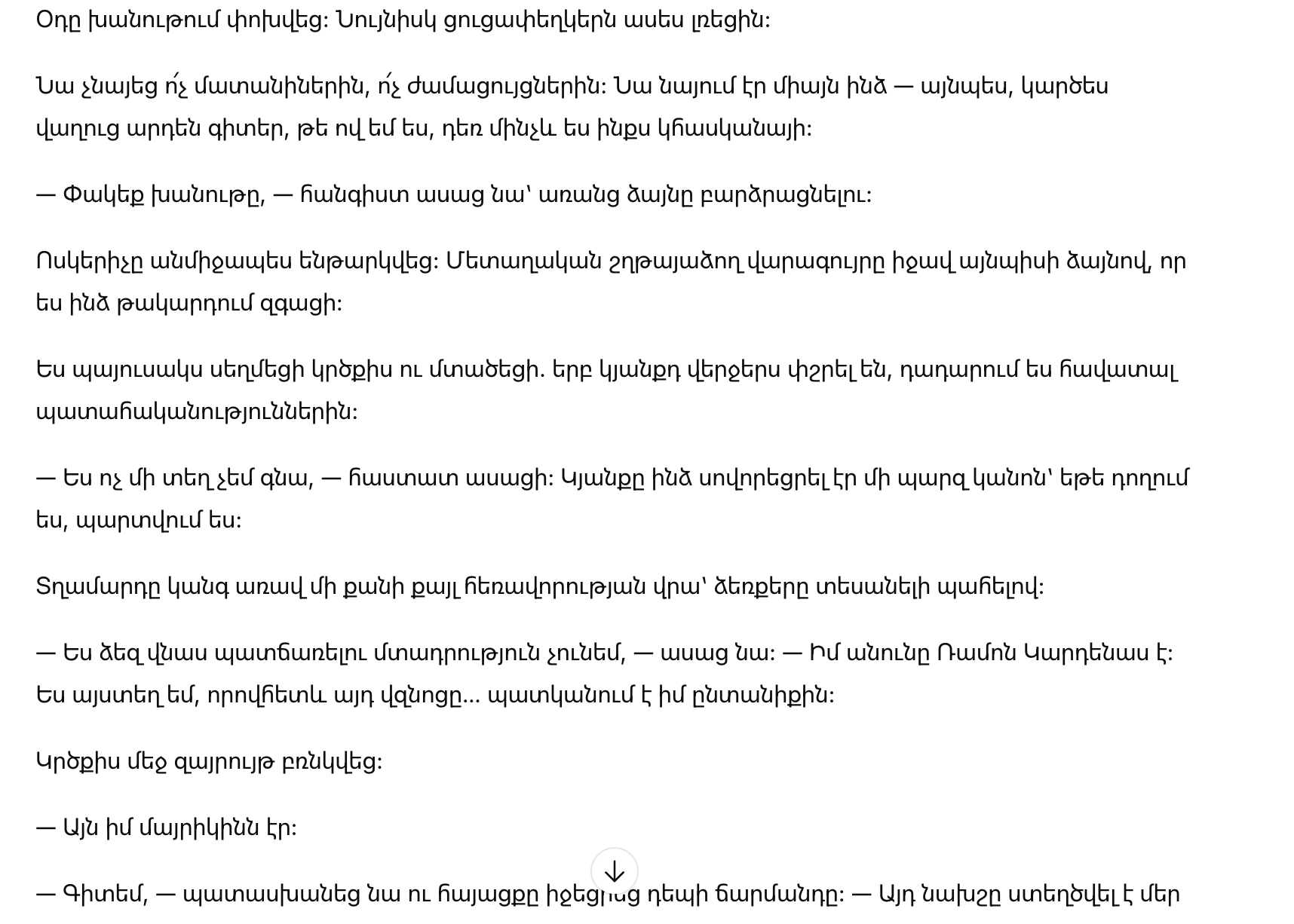 — Я не собираюсь причинять вам вред, — произнёс он. — Меня зовут Рамон Карденас. Я здесь потому, что это ожерелье… принадлежит моей семье.