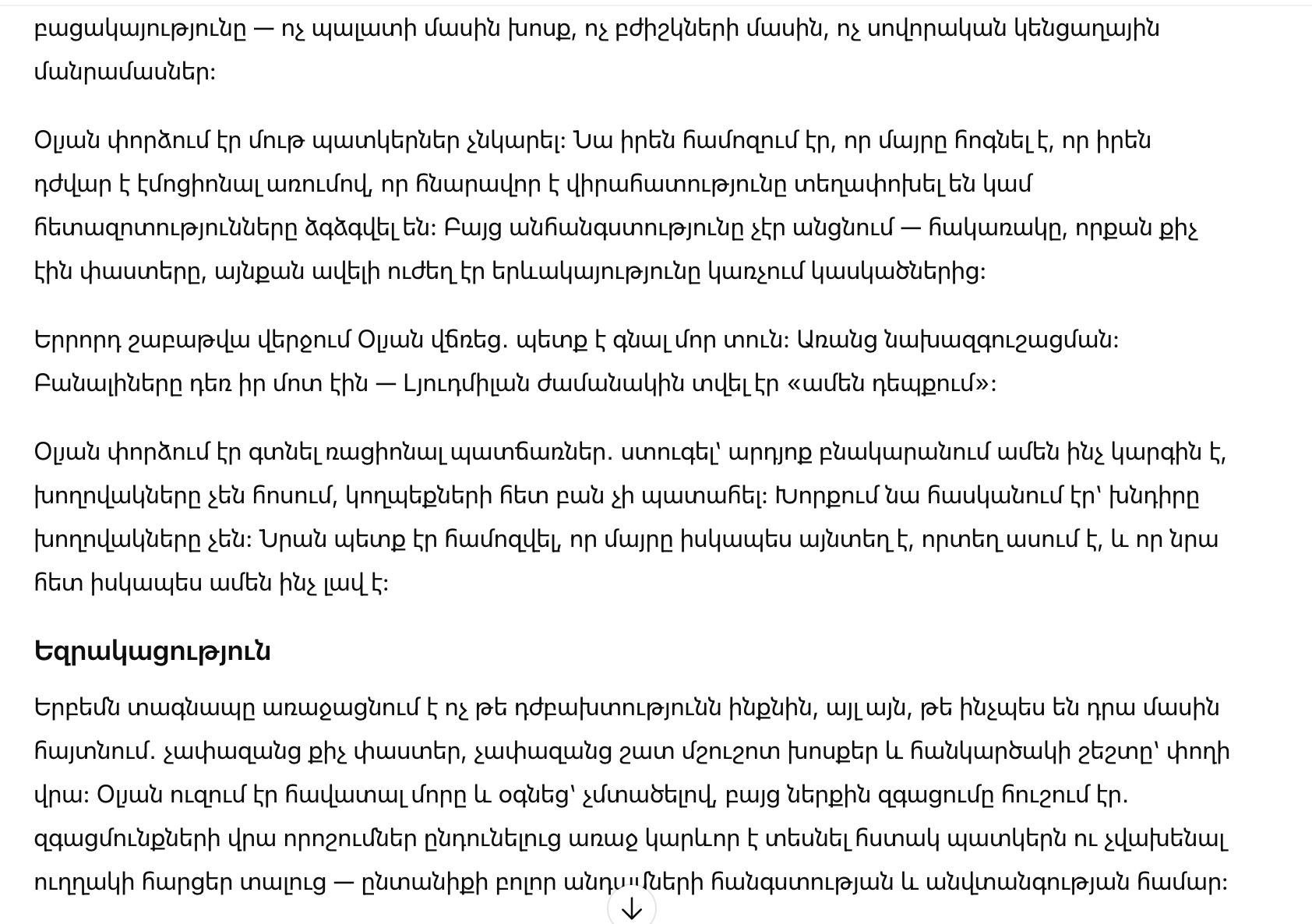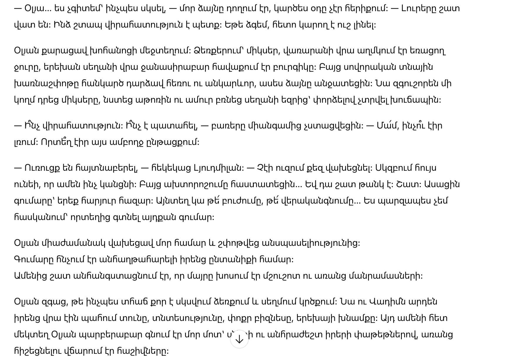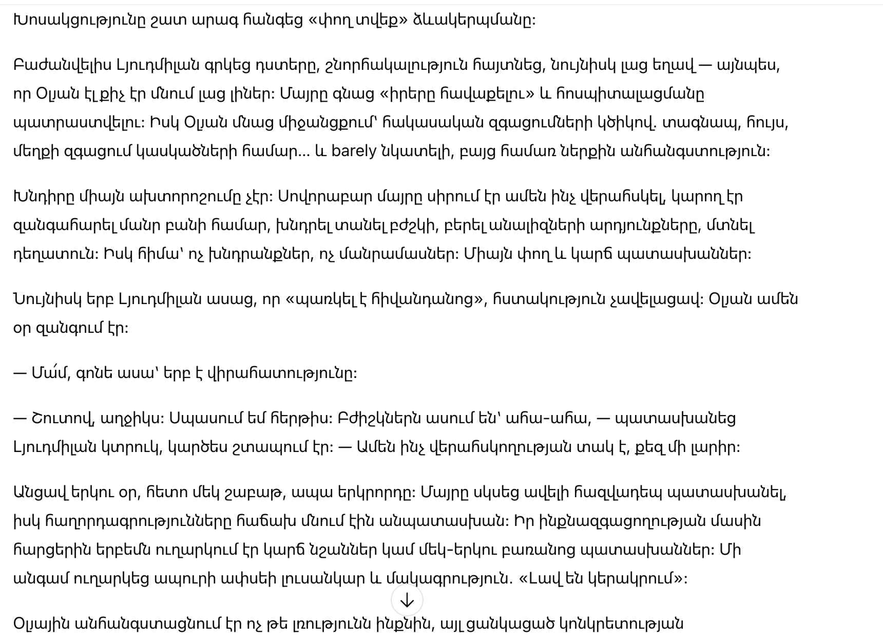 Олю тревожило не молчание само по себе, а отсутствие любой конкретики — ни палаты, ни разговоров о врачах, ни привычных бытовых деталей.