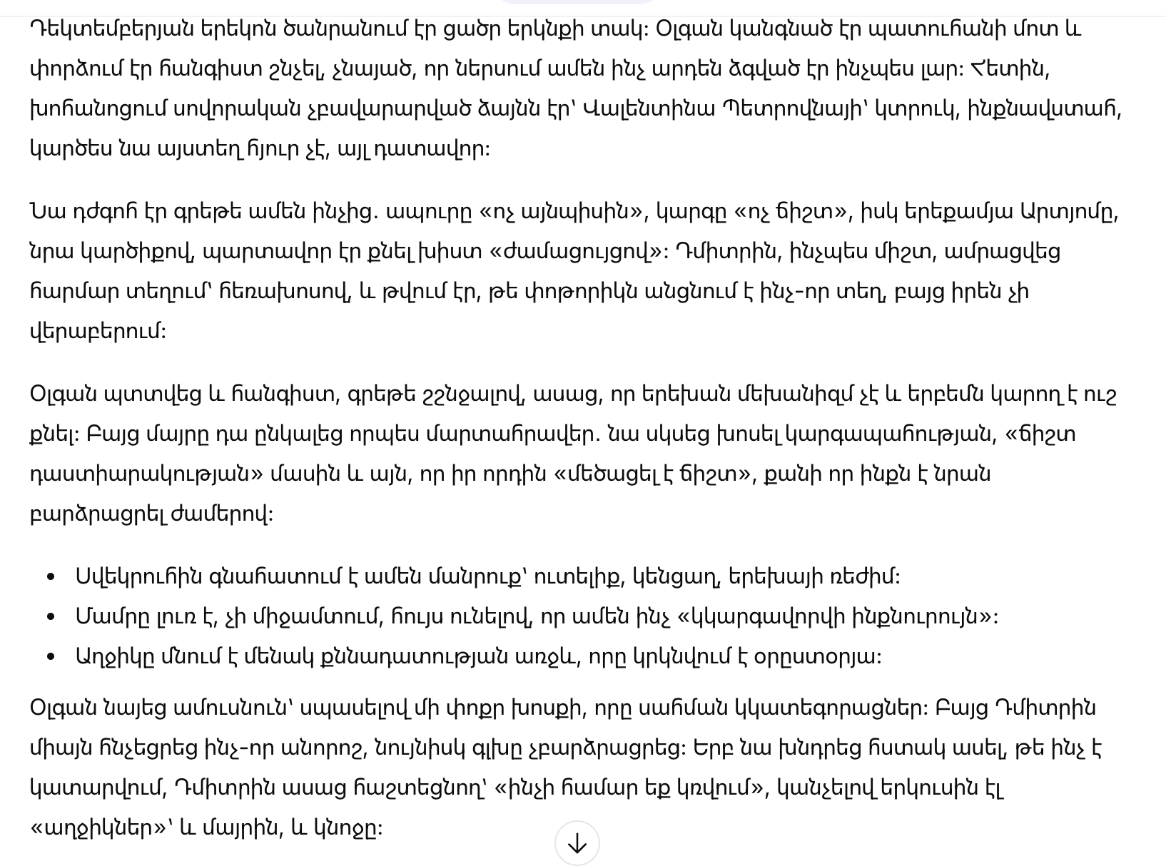 Ей не понравилось буквально всё: суп «не такой», порядок «не тот», а трёхлетний Артём, по её мнению, обязан был спать строго «по расписанию». Дмитрий, как и всегда, устроился поудобнее с телефоном и делал вид, что буря проходит где-то рядом, но не касается его.