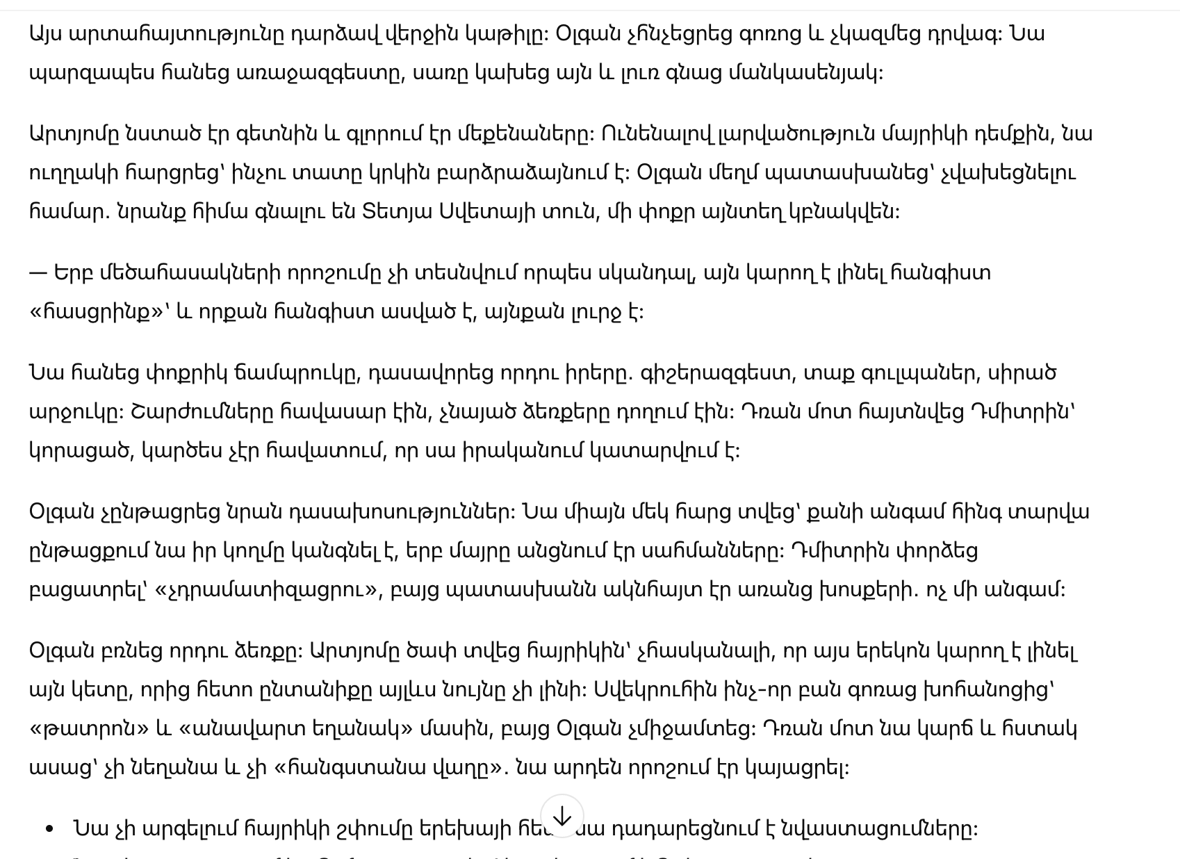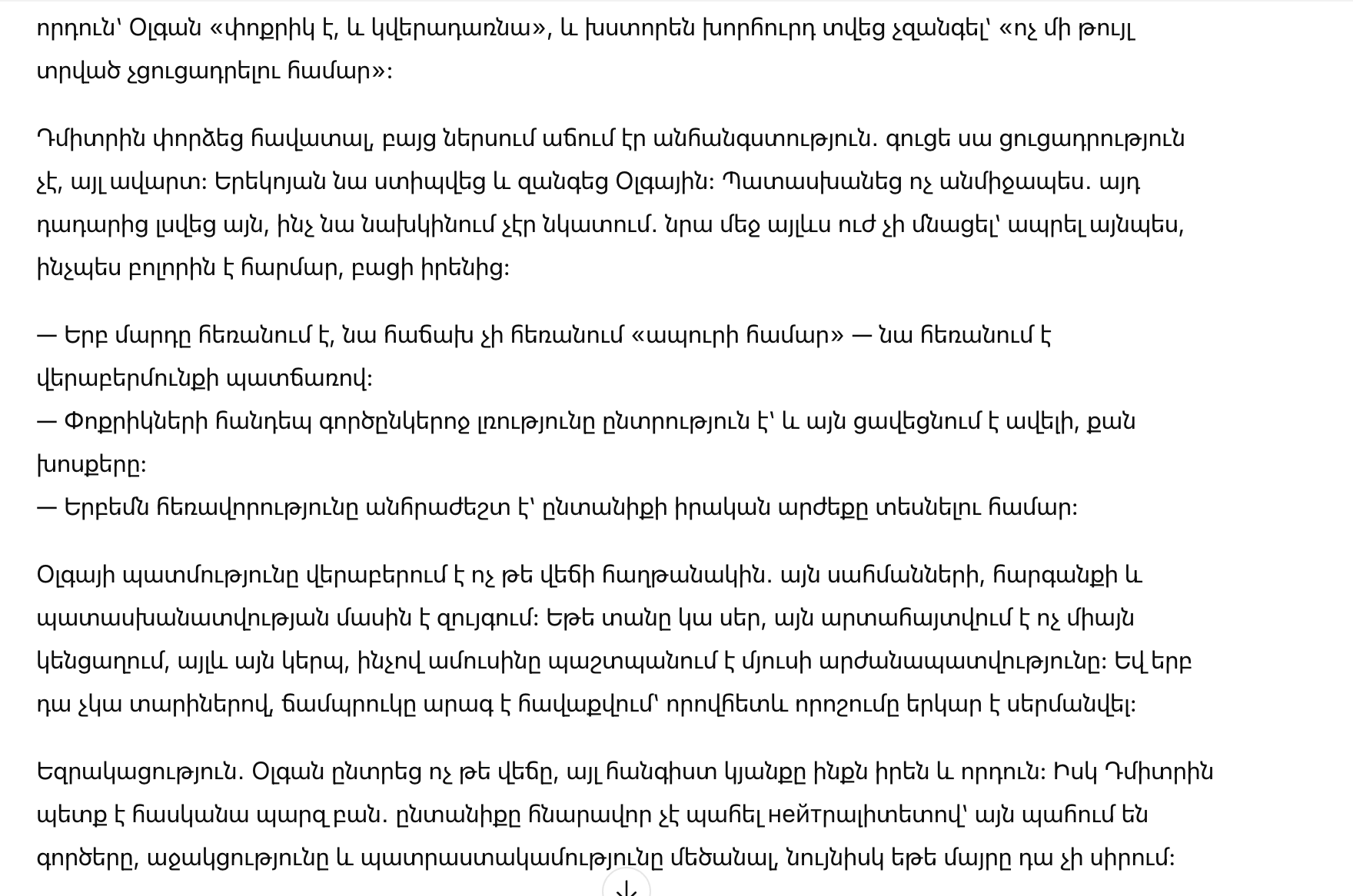Вывод: Ольга выбрала не конфликт, а спокойную жизнь для себя и ребёнка. А Дмитрию предстоит понять простую вещь: семью невозможно сохранить нейтралитетом — её удерживают поступки, поддержка и готовность взрослеть, даже если это не нравится маме.