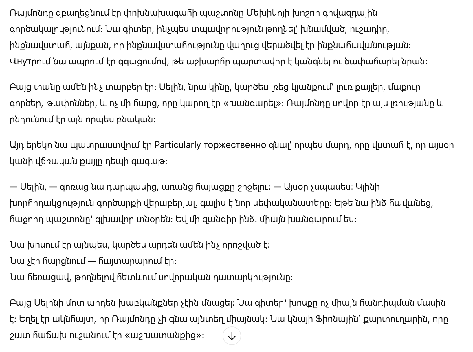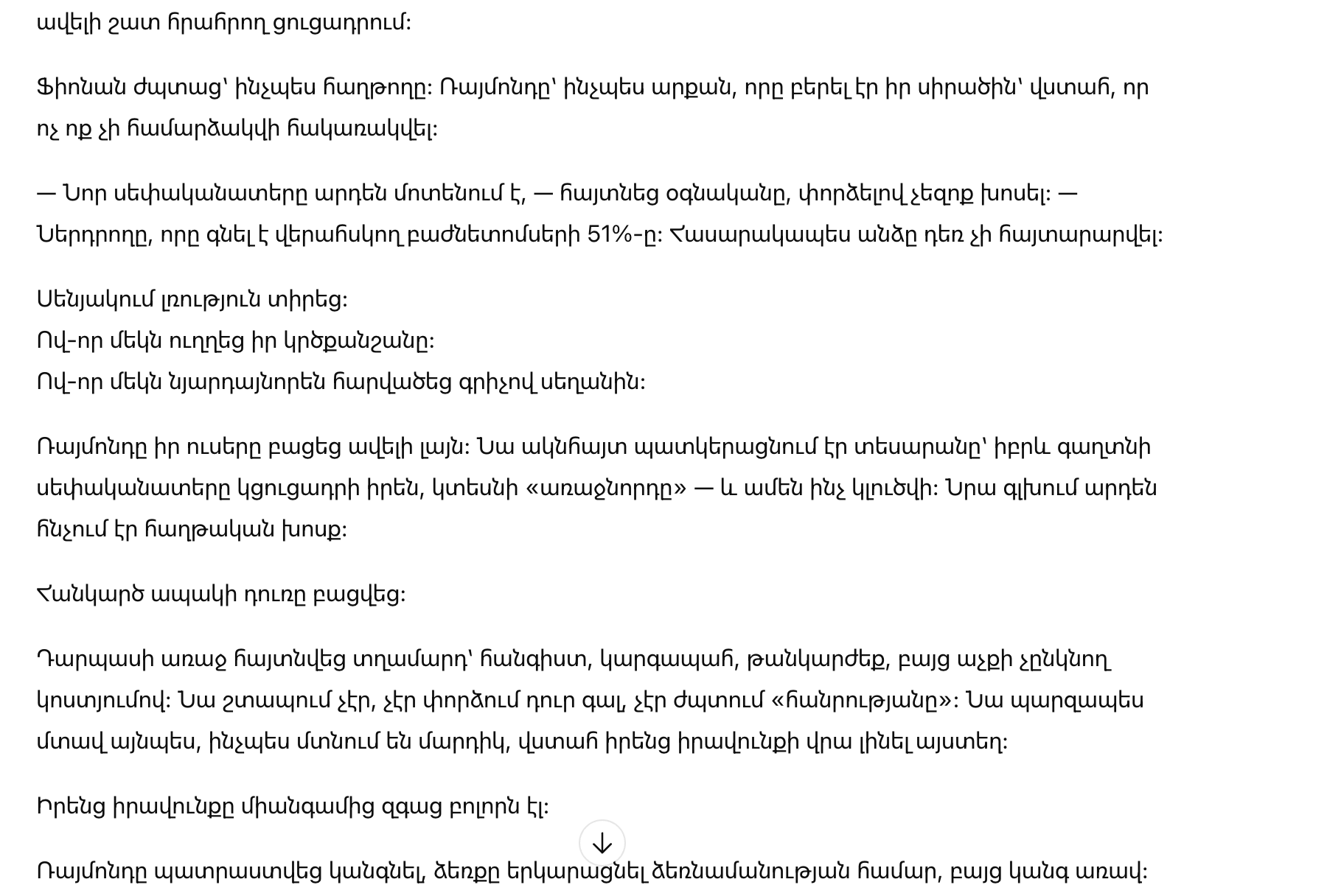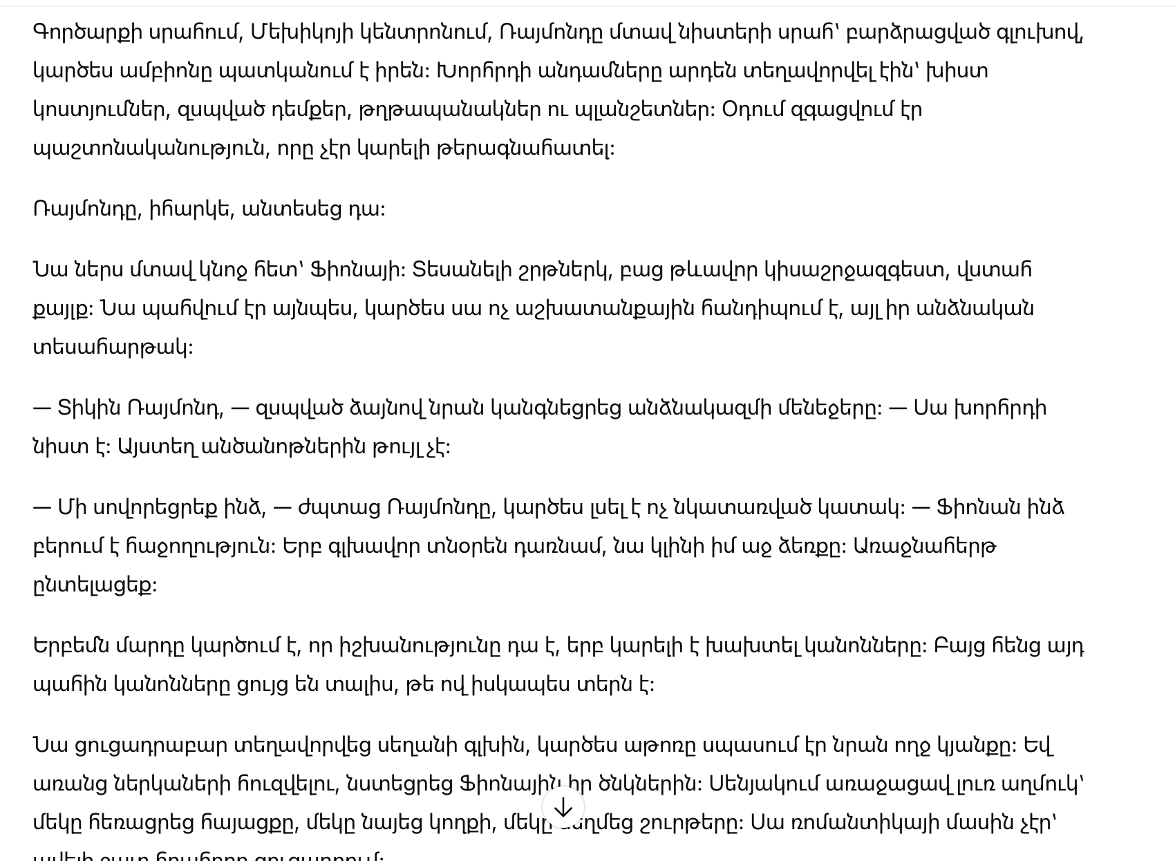 Новый владелец прошёл к столу, оглядел присутствующих и остановил взгляд на Раймонде. В его спокойствии чувствовалась не холодность, а контроль — тот самый, которого у Раймонда не было, несмотря на весь показной блеск.